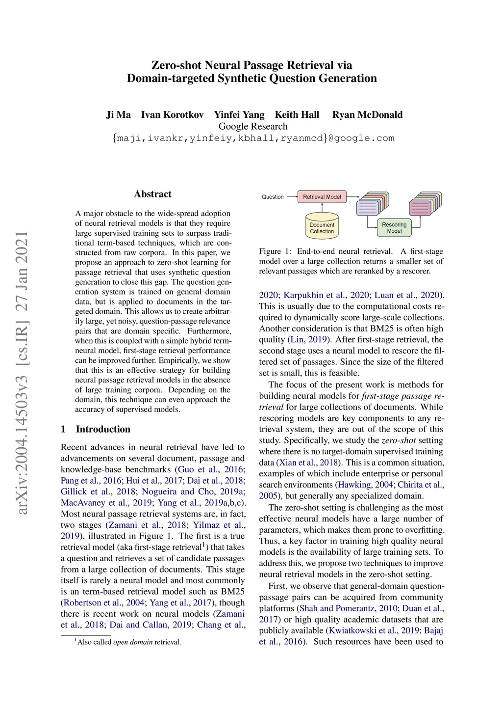 A major obstacle to the wide-spread adoption of neural retrieval models is that they require large supervised training sets to surpass traditional term-based techniques, which are constructed from raw corpora. In this paper, we propose an approach to zero-shot learning for passage retrieval that uses synthetic question generation to close this gap. The question generation system is trained on general domain data, but is applied to documents in the targeted domain. This allows us to create arbitrarily large, yet noisy, question-passage relevance pairs that are domain specific. Furthermore, when this is coupled with a simple hybrid term-neural model, first-stage retrieval performance can be improved further. Empirically, we show that this is an effective strategy for building neural passage retrieval models in the absence of large training corpora. Depending on the domain, this technique can even approach the accuracy of supervised models.