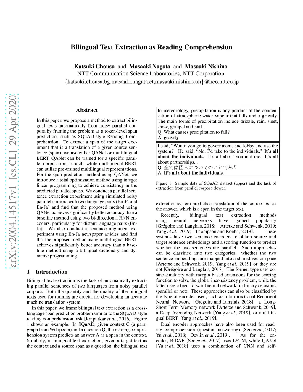 In this paper, we propose a method to extract bilingual texts automatically from noisy parallel corpora by framing the problem as a token-level span prediction, such as SQuAD-style Reading Comprehension. To extract a span of the target document that is a translation of a given source sentence (span), we use either QANet or multilingual BERT. QANet can be trained for a specific parallel corpus from scratch, while multilingual BERT can utilize pre-trained multilingual representations. For the span prediction method using QANet, we introduce a total optimization method using integer linear programming to achieve consistency in the predicted parallel spans. We conduct a parallel sentence extraction experiment using simulated noisy parallel corpora with two language pairs (En-Fr and En-Ja) and find that the proposed method using QANet achieves significantly better accuracy than a baseline method using two bi-directional RNN encoders, particularly for distant language pairs (En-Ja). We also conduct a sentence alignment experiment using En-Ja newspaper articles and find that the proposed method using multilingual BERT achieves significantly better accuracy than a baseline method using a bilingual dictionary and dynamic programming.
