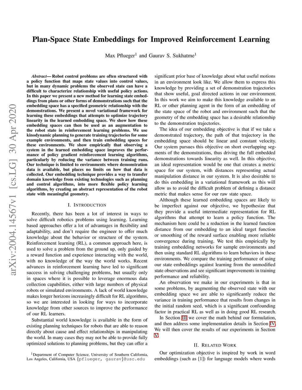 Robot control problems are often structured with a policy function that maps state values into control values, but in many dynamic problems the observed state can have a difficult to characterize relationship with useful policy actions. In this paper we present a new method for learning state embeddings from plans or other forms of demonstrations such that the embedding space has a specified geometric relationship with the demonstrations. We present a novel variational framework for learning these embeddings that attempts to optimize trajectory linearity in the learned embedding space. We show how these embedding spaces can then be used as an augmentation to the robot state in reinforcement learning problems. We use kinodynamic planning to generate training trajectories for some example environments, and then train embedding spaces for these environments. We show empirically that observing a system in the learned embedding space improves the performance of policy gradient reinforcement learning algorithms, particularly by reducing the variance between training runs. Our technique is limited to environments where demonstration data is available, but places no limits on how that data is collected. Our embedding technique provides a way to transfer domain knowledge from existing technologies such as planning and control algorithms, into more flexible policy learning algorithms, by creating an abstract representation of the robot state with meaningful geometry.