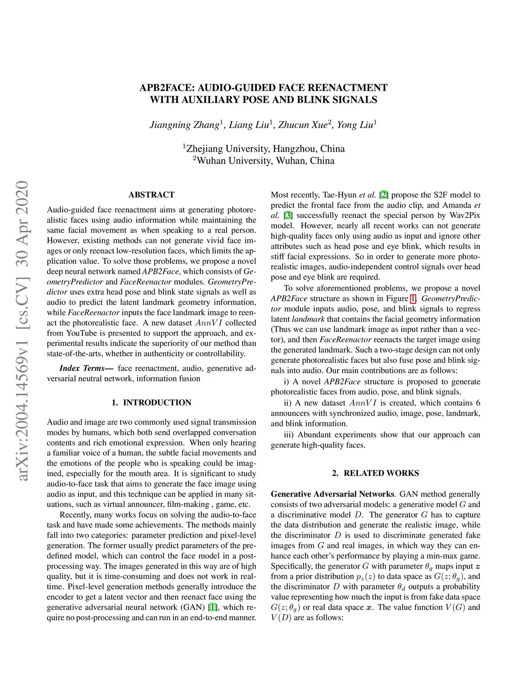 APB2Face: Audio-guided face reenactment with auxiliary pose and blink