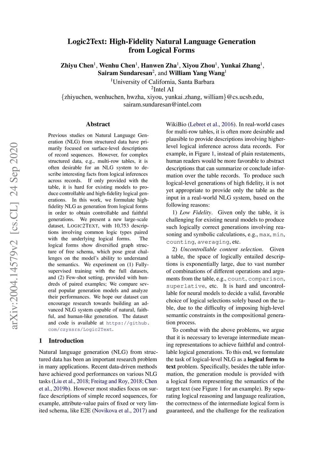 Logic2Text: High-Fidelity Natural Language Generation from Logical Forms