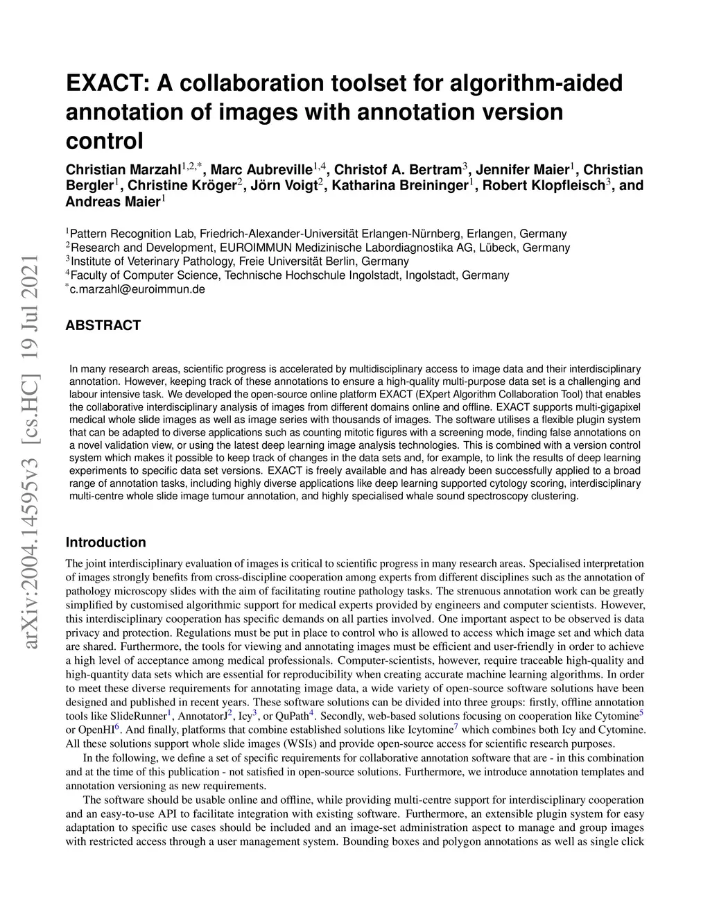 In many research areas, scientific progress is accelerated by multidisciplinary access to image data and their interdisciplinary annotation. However, keeping track of these annotations to ensure a high-quality multi-purpose data set is a challenging and labour intensive task. We developed the open-source online platform EXACT (EXpert Algorithm Collaboration Tool) that enables the collaborative interdisciplinary analysis of images from different domains online and offline. EXACT supports multi-gigapixel medical whole slide images as well as image series with thousands of images. The software utilises a flexible plugin system that can be adapted to diverse applications such as counting mitotic figures with a screening mode, finding false annotations on a novel validation view, or using the latest deep learning image analysis technologies. This is combined with a version control system which makes it possible to keep track of changes in the data sets and, for example, to link the results of deep learning experiments to specific data set versions. EXACT is freely available and has already been successfully applied to a broad range of annotation tasks, including highly diverse applications like deep learning supported cytology scoring, interdisciplinary multi-centre whole slide image tumour annotation, and highly specialised whale sound spectroscopy clustering.
