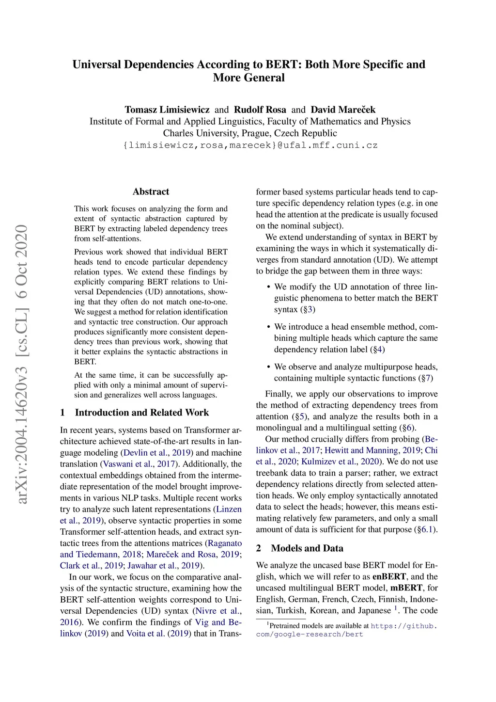 This work focuses on analyzing the form and extent of syntactic abstraction captured by BERT by extracting labeled dependency trees from self-attentions. Previous work showed that individual BERT heads tend to encode particular dependency relation types. We extend these findings by explicitly comparing BERT relations to Universal Dependencies (UD) annotations, showing that they often do not match one-to-one. We suggest a method for relation identification and syntactic tree construction. Our approach produces significantly more consistent dependency trees than previous work, showing that it better explains the syntactic abstractions in BERT. At the same time, it can be successfully applied with only a minimal amount of supervision and generalizes well across languages.
