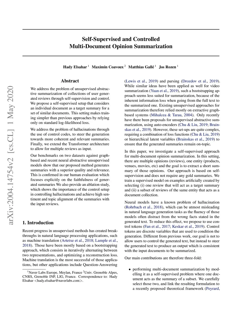 We address the problem of unsupervised abstractive summarization of collections of user generated reviews with self-supervision and control. We propose a self-supervised setup that considers an individual document as a target summary for a set of similar documents. This setting makes training simpler than previous approaches by relying only on standard log-likelihood loss. We address the problem of hallucinations through the use of control codes, to steer the generation towards more coherent and relevant summaries.Finally, we extend the Transformer architecture to allow for multiple reviews as input. Our benchmarks on two datasets against graph-based and recent neural abstractive unsupervised models show that our proposed method generates summaries with a superior quality and relevance.This is confirmed in our human evaluation which focuses explicitly on the faithfulness of generated summaries We also provide an ablation study, which shows the importance of the control setup in controlling hallucinations and achieve high sentiment and topic alignment of the summaries with the input reviews.