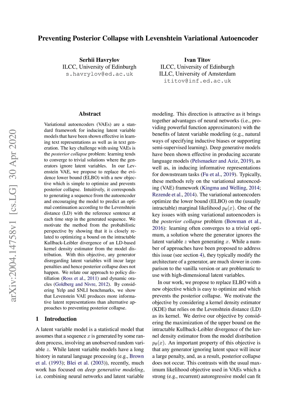 Preventing Posterior Collapse with Levenshtein Variational Autoencoder