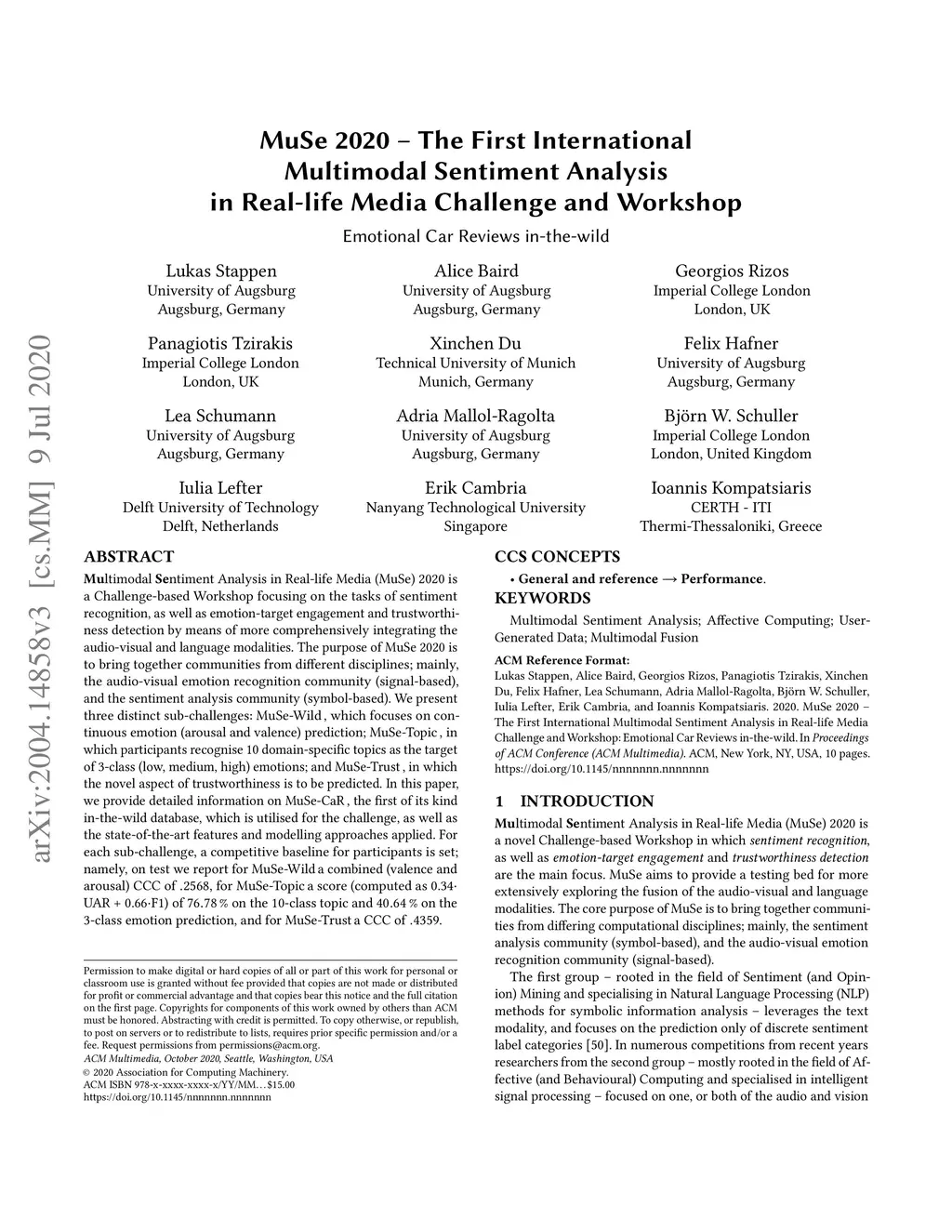 MuSe 2020 -- The First International Multimodal Sentiment Analysis in