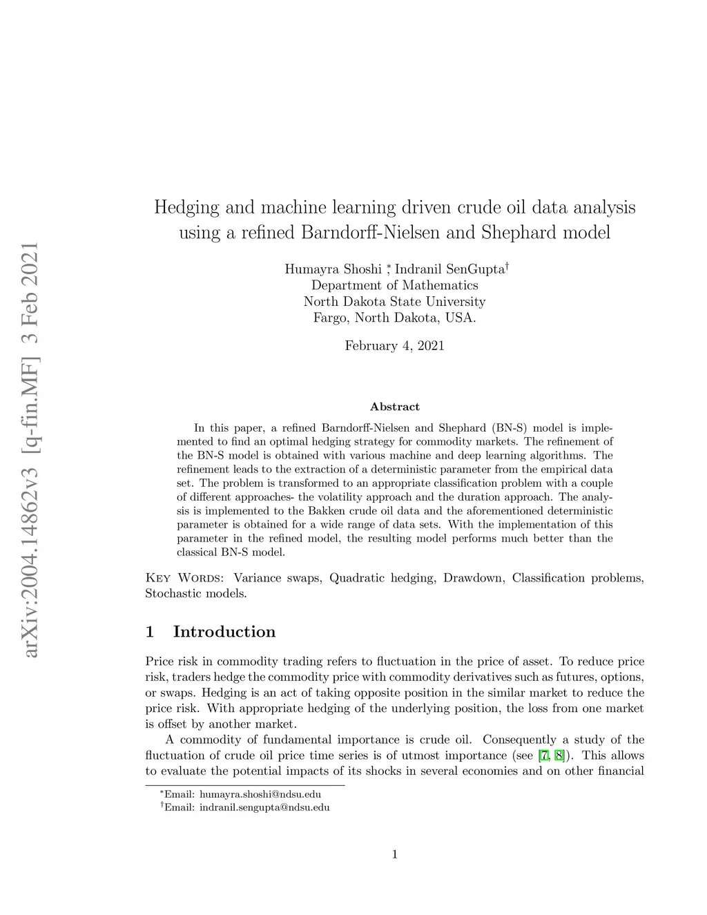 In this paper, a refined Barndorff-Nielsen and Shephard (BN-S) model is implemented to find an optimal hedging strategy for commodity markets. The refinement of the BN-S model is obtained with various machine and deep learning algorithms. The refinement leads to the extraction of a deterministic parameter from the empirical data set. The problem is transformed to an appropriate classification problem with a couple of different approaches: the volatility approach and the duration approach. The analysis is implemented to the Bakken crude oil data and the aforementioned deterministic parameter is obtained for a wide range of data sets. With the implementation of this parameter in the refined model, the resulting model performs much better than the classical BN-S model.