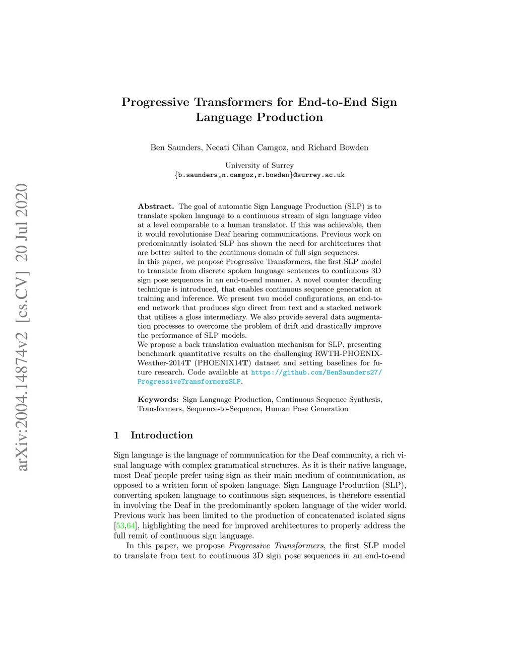 The goal of automatic Sign Language Production (SLP) is to translate spoken language to a continuous stream of sign language video at a level comparable to a human translator. If this was achievable, then it would revolutionise Deaf hearing communications. Previous work on predominantly isolated SLP has shown the need for architectures that are better suited to the continuous domain of full sign sequences. In this paper, we propose Progressive Transformers, a novel architecture that can translate from discrete spoken language sentences to continuous 3D skeleton pose outputs representing sign language. We present two model configurations, an end-to-end network that produces sign direct from text and a stacked network that utilises a gloss intermediary. Our transformer network architecture introduces a counter that enables continuous sequence generation at training and inference. We also provide several data augmentation processes to overcome the problem of drift and improve the performance of SLP models. We propose a back translation evaluation mechanism for SLP, presenting benchmark quantitative results on the challenging RWTH-PHOENIX-Weather-2014T(PHOENIX14T) dataset and setting baselines for future research.