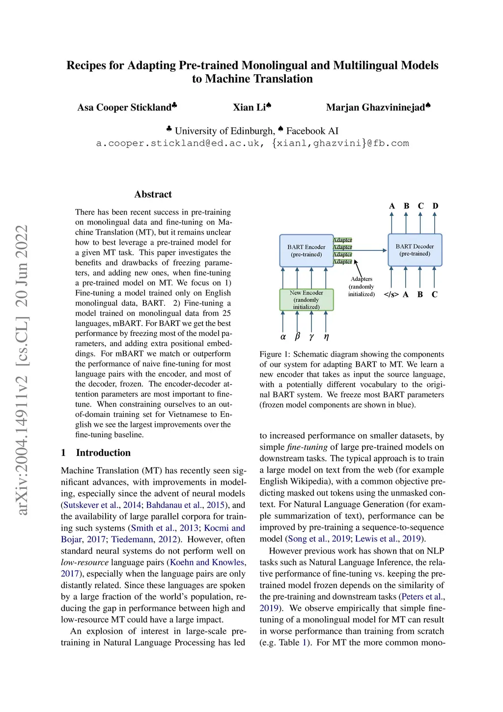 There has been recent success in pre-training on monolingual data and fine-tuning on Machine Translation (MT), but it remains unclear how to best leverage a pre-trained model for a given MT task. This paper investigates the benefits and drawbacks of freezing parameters, and adding new ones, when fine-tuning a pre-trained model on MT. We focus on 1) Fine-tuning a model trained only on English monolingual data, BART. 2) Fine-tuning a model trained on monolingual data from 25 languages, mBART. For BART we get the best performance by freezing most of the model parameters, and adding extra positional embeddings. For mBART we match or outperform the performance of naive fine-tuning for most language pairs with the encoder, and most of the decoder, frozen. The encoder-decoder attention parameters are most important to fine-tune. When constraining ourselves to an out-of-domain training set for Vietnamese to English we see the largest improvements over the fine-tuning baseline.