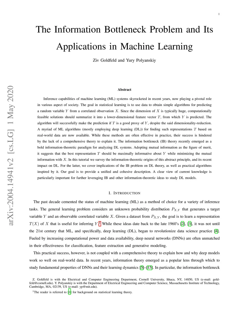 Inference capabilities of machine learning (ML) systems skyrocketed in recent years, now playing a pivotal role in various aspect of society. The goal in statistical learning is to use data to obtain simple algorithms for predicting a random variable from a correlated observation . Since the dimension of is typically huge, computationally feasible solutions should summarize it into a lower-dimensional feature vector , from which is predicted. The algorithm will successfully make the prediction if is a good proxy of , despite the said dimensionality-reduction. A myriad of ML algorithms (mostly employing deep learning (DL)) for finding such representations based on real-world data are now available. While these methods are often effective in practice, their success is hindered by the lack of a comprehensive theory to explain it. The information bottleneck (IB) theory recently emerged as a bold information-theoretic paradigm for analyzing DL systems. Adopting mutual information as the figure of merit, it suggests that the best representation should be maximally informative about while minimizing the mutual information with . In this tutorial we survey the information-theoretic origins of this abstract principle, and its recent impact on DL. For the latter, we cover implications of the IB problem on DL theory, as well as practical algorithms inspired by it. Our goal is to provide a unified and cohesive description. A clear view of current knowledge is particularly important for further leveraging IB and other information-theoretic ideas to study DL models.
