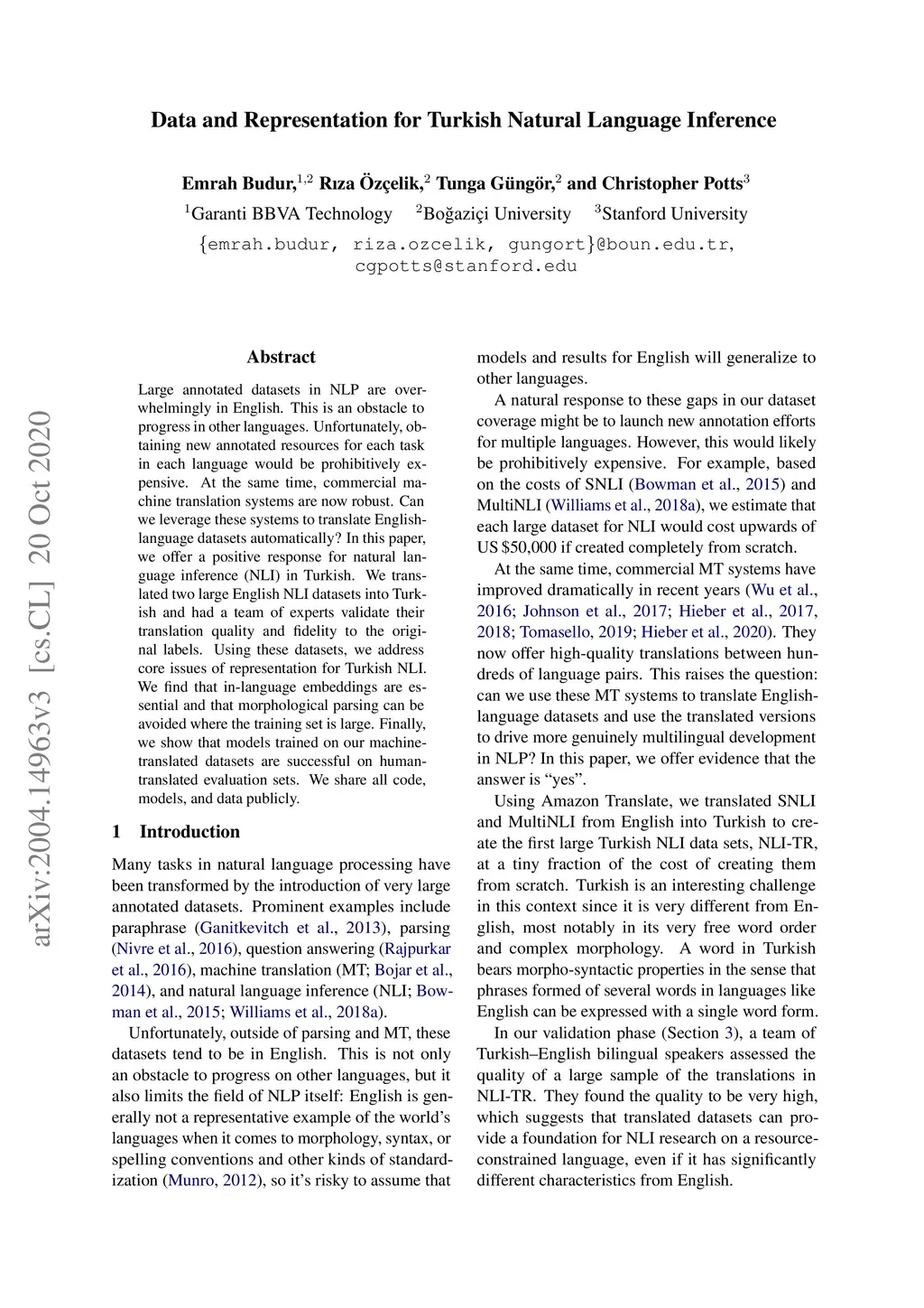 Large annotated datasets in NLP are overwhelmingly in English. This is an obstacle to progress in other languages. Unfortunately, obtaining new annotated resources for each task in each language would be prohibitively expensive. At the same time, commercial machine translation systems are now robust. Can we leverage these systems to translate English-language datasets automatically? In this paper, we offer a positive response for natural language inference (NLI) in Turkish. We translated two large English NLI datasets into Turkish and had a team of experts validate their translation quality and fidelity to the original labels. Using these datasets, we address core issues of representation for Turkish NLI. We find that in-language embeddings are essential and that morphological parsing can be avoided where the training set is large. Finally, we show that models trained on our machine-translated datasets are successful on human-translated evaluation sets. We share all code, models, and data publicly.