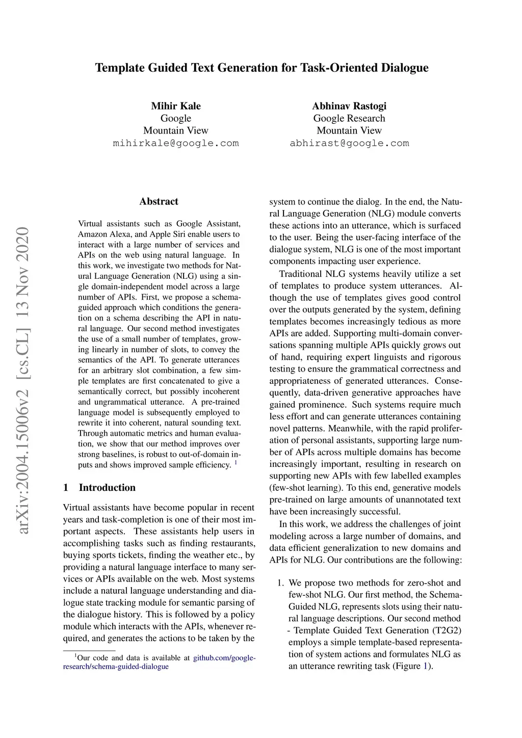 Virtual assistants such as Google Assistant, Amazon Alexa, and Apple Siri enable users to interact with a large number of services and APIs on the web using natural language. In this work, we investigate two methods for Natural Language Generation (NLG) using a single domain-independent model across a large number of APIs. First, we propose a schema-guided approach which conditions the generation on a schema describing the API in natural language. Our second method investigates the use of a small number of templates, growing linearly in number of slots, to convey the semantics of the API. To generate utterances for an arbitrary slot combination, a few simple templates are first concatenated to give a semantically correct, but possibly incoherent and ungrammatical utterance. A pre-trained language model is subsequently employed to rewrite it into coherent, natural sounding text. Through automatic metrics and human evaluation, we show that our method improves over strong baselines, is robust to out-of-domain inputs and shows improved sample efficiency.
