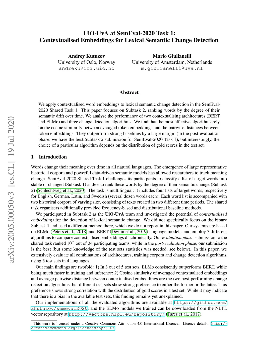 UiO-UvA at SemEval-2020 Task 1: Contextualised Embeddings for Lexical