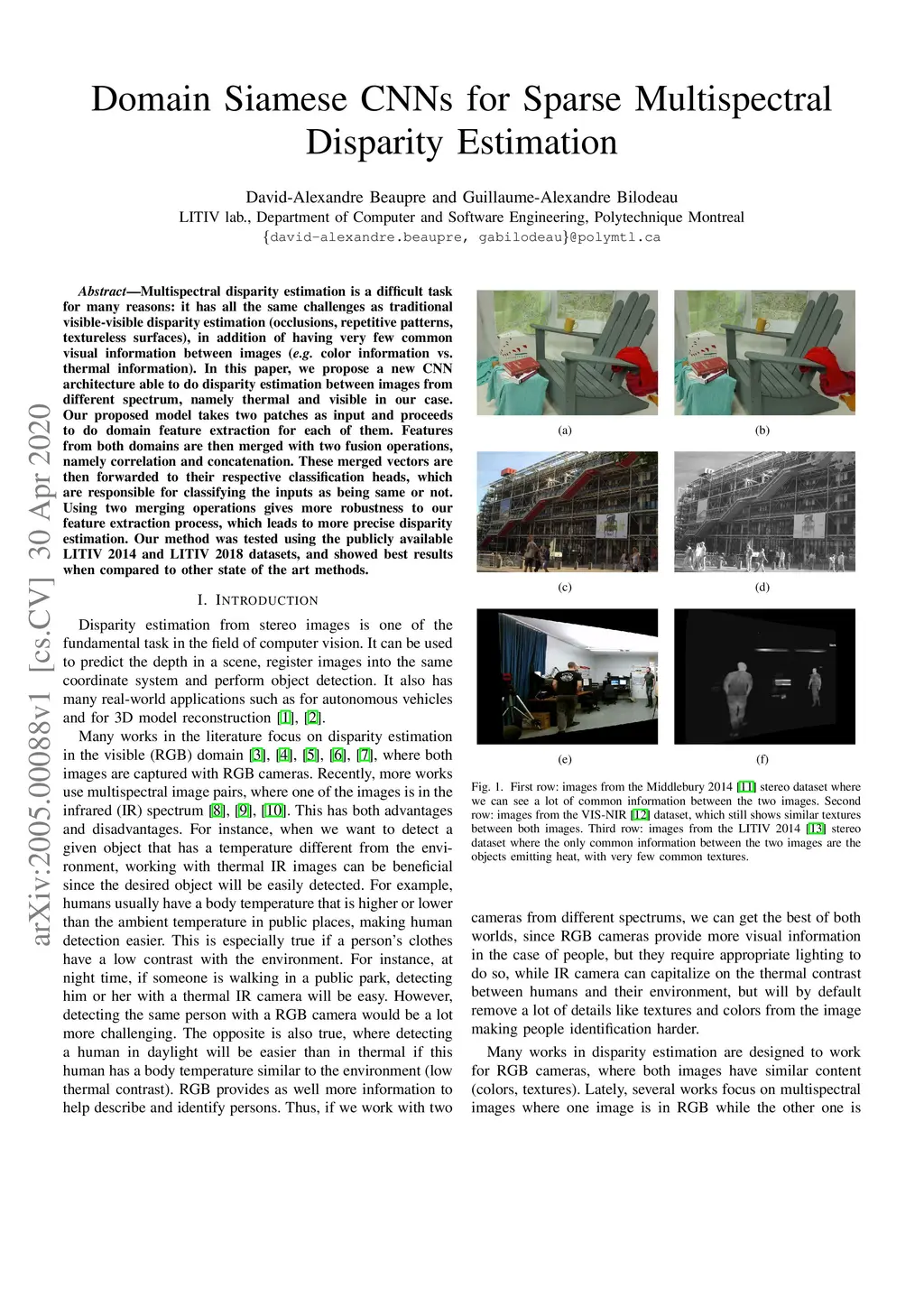 Multispectral disparity estimation is a difficult task for many reasons: it has all the same challenges as traditional visible-visible disparity estimation (occlusions, repetitive patterns, textureless surfaces), in addition of having very few common visual information between images (e.g. color information vs. thermal information). In this paper, we propose a new CNN architecture able to do disparity estimation between images from different spectrum, namely thermal and visible in our case. Our proposed model takes two patches as input and proceeds to do domain feature extraction for each of them. Features from both domains are then merged with two fusion operations, namely correlation and concatenation. These merged vectors are then forwarded to their respective classification heads, which are responsible for classifying the inputs as being same or not. Using two merging operations gives more robustness to our feature extraction process, which leads to more precise disparity estimation. Our method was tested using the publicly available LITIV 2014 and LITIV 2018 datasets, and showed best results when compared to other state of the art methods.