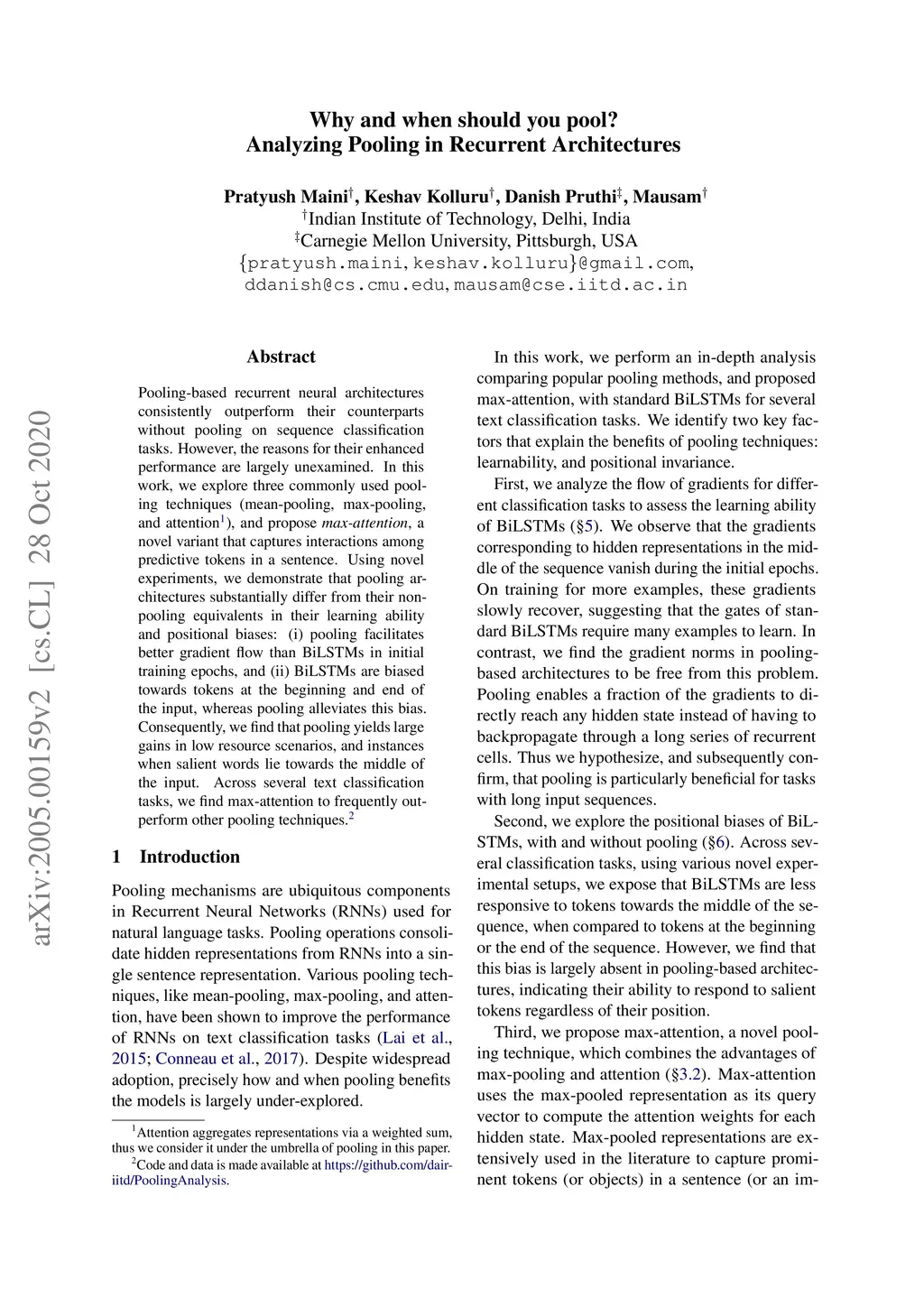 Pooling-based recurrent neural architectures consistently outperform their counterparts without pooling. However, the reasons for their enhanced performance are largely unexamined. In this work, we examine three commonly used pooling techniques (mean-pooling, max-pooling, and attention), and propose max-attention, a novel variant that effectively captures interactions among predictive tokens in a sentence. We find that pooling-based architectures substantially differ from their non-pooling equivalents in their learning ability and positional biases--which elucidate their performance benefits. By analyzing the gradient propagation, we discover that pooling facilitates better gradient flow compared to BiLSTMs. Further, we expose how BiLSTMs are positionally biased towards tokens in the beginning and the end of a sequence. Pooling alleviates such biases. Consequently, we identify settings where pooling offers large benefits: (i) in low resource scenarios, and (ii) when important words lie towards the middle of the sentence. Among the pooling techniques studied, max-attention is the most effective, resulting in significant performance gains on several text classification tasks.