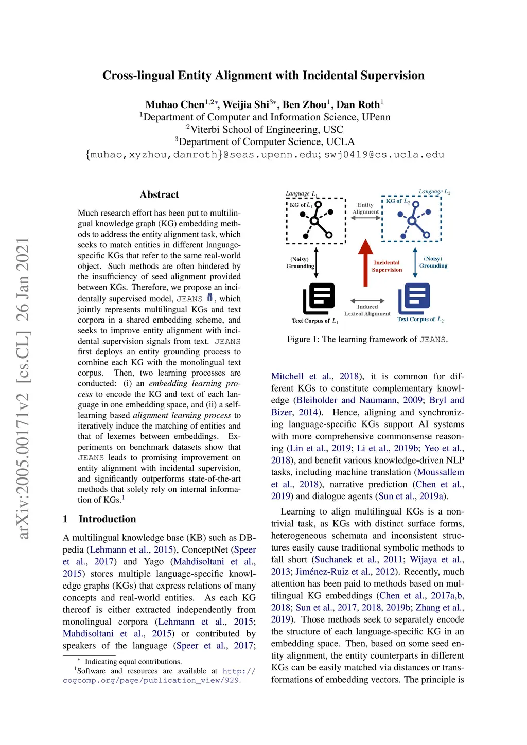 Much research effort has been put to multilingual knowledge graph (KG) embedding methods to address the entity alignment task, which seeks to match entities in different languagespecific KGs that refer to the same real-world object. Such methods are often hindered by the insufficiency of seed alignment provided between KGs. Therefore, we propose an incidentally supervised model, JEANS , which jointly represents multilingual KGs and text corpora in a shared embedding scheme, and seeks to improve entity alignment with incidental supervision signals from text. JEANS first deploys an entity grounding process to combine each KG with the monolingual text corpus. Then, two learning processes are conducted: (i) an embedding learning process to encode the KG and text of each language in one embedding space, and (ii) a selflearning based alignment learning process to iteratively induce the matching of entities and that of lexemes between embeddings. Experiments on benchmark datasets show that JEANS leads to promising improvement on entity alignment with incidental supervision, and significantly outperforms state-of-the-art methods that solely rely on internal information of KGs.