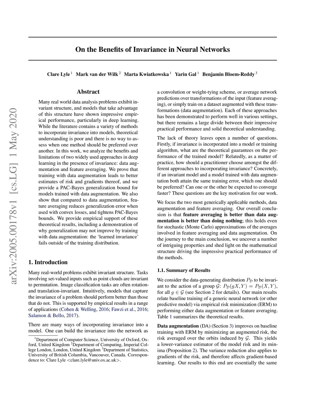 Many real world data analysis problems exhibit invariant structure, and models that take advantage of this structure have shown impressive empirical performance, particularly in deep learning. While the literature contains a variety of methods to incorporate invariance into models, theoretical understanding is poor and there is no way to assess when one method should be preferred over another. In this work, we analyze the benefits and limitations of two widely used approaches in deep learning in the presence of invariance: data augmentation and feature averaging. We prove that training with data augmentation leads to better estimates of risk and gradients thereof, and we provide a PAC-Bayes generalization bound for models trained with data augmentation. We also show that compared to data augmentation, feature averaging reduces generalization error when used with convex losses, and tightens PAC-Bayes bounds. We provide empirical support of these theoretical results, including a demonstration of why generalization may not improve by training with data augmentation: the `learned invariance' fails outside of the training distribution.