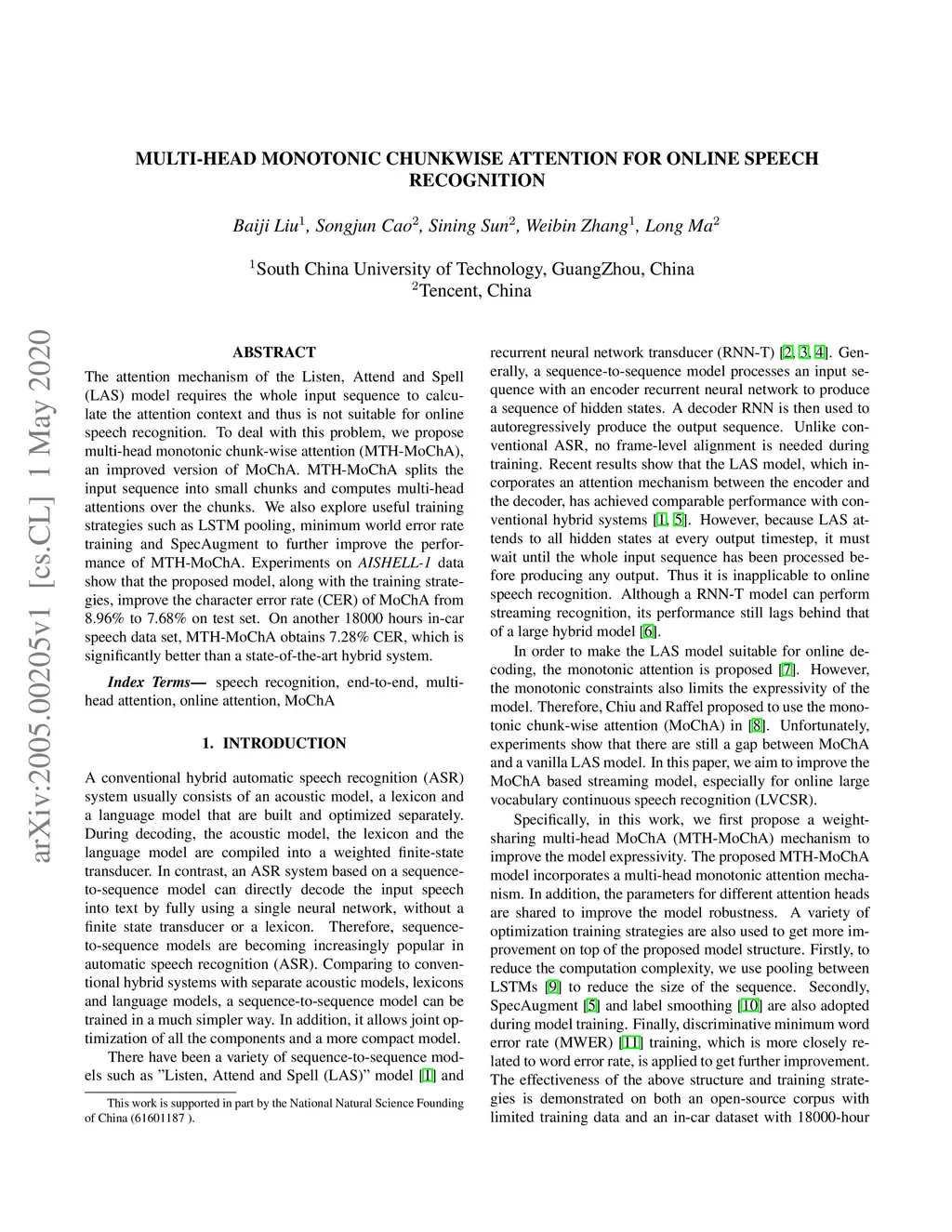 The attention mechanism of the Listen, Attend and Spell (LAS) model requires the whole input sequence to calculate the attention context and thus is not suitable for online speech recognition. To deal with this problem, we propose multi-head monotonic chunk-wise attention (MTH-MoChA), an improved version of MoChA. MTH-MoChA splits the input sequence into small chunks and computes multi-head attentions over the chunks. We also explore useful training strategies such as LSTM pooling, minimum world error rate training and SpecAugment to further improve the performance of MTH-MoChA. Experiments on AISHELL-1 data show that the proposed model, along with the training strategies, improve the character error rate (CER) of MoChA from 8.96% to 7.68% on test set. On another 18000 hours in-car speech data set, MTH-MoChA obtains 7.28% CER, which is significantly better than a state-of-the-art hybrid system.