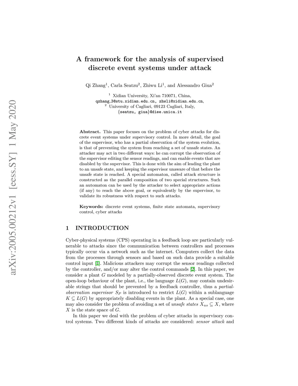 This paper focuses on the problem of cyber attacks for discrete event systems under supervisory control. In more detail, the goal of the supervisor, who has a partial observation of the system evolution, is that of preventing the system from reaching a set of unsafe states. An attacker may act in two different ways: he can corrupt the observation of the supervisor editing the sensor readings, and can enable events that are disabled by the supervisor. This is done with the aim of leading the plant to an unsafe state, and keeping the supervisor unaware of that before the unsafe state is reached. A special automaton, called attack structure is constructed as the parallel composition of two special structures. Such an automaton can be used by the attacker to select appropriate actions (if any) to reach the above goal, or equivalently by the supervisor, to validate its robustness with respect to such attacks.