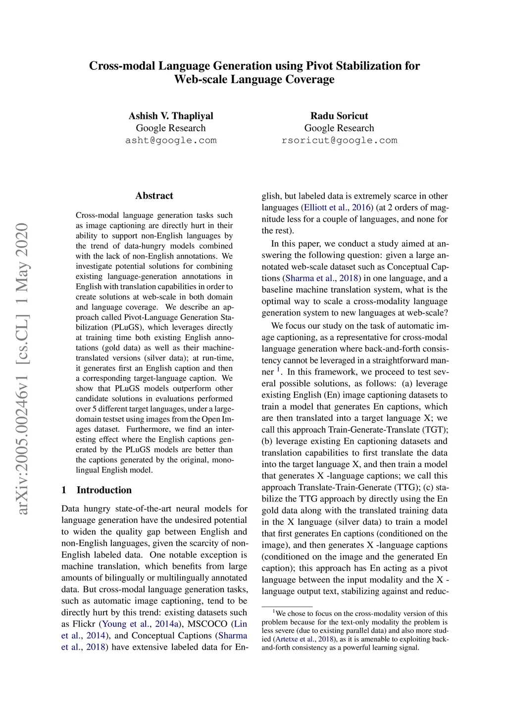 Cross-modal Language Generation using Pivot Stabilization for Web-scale