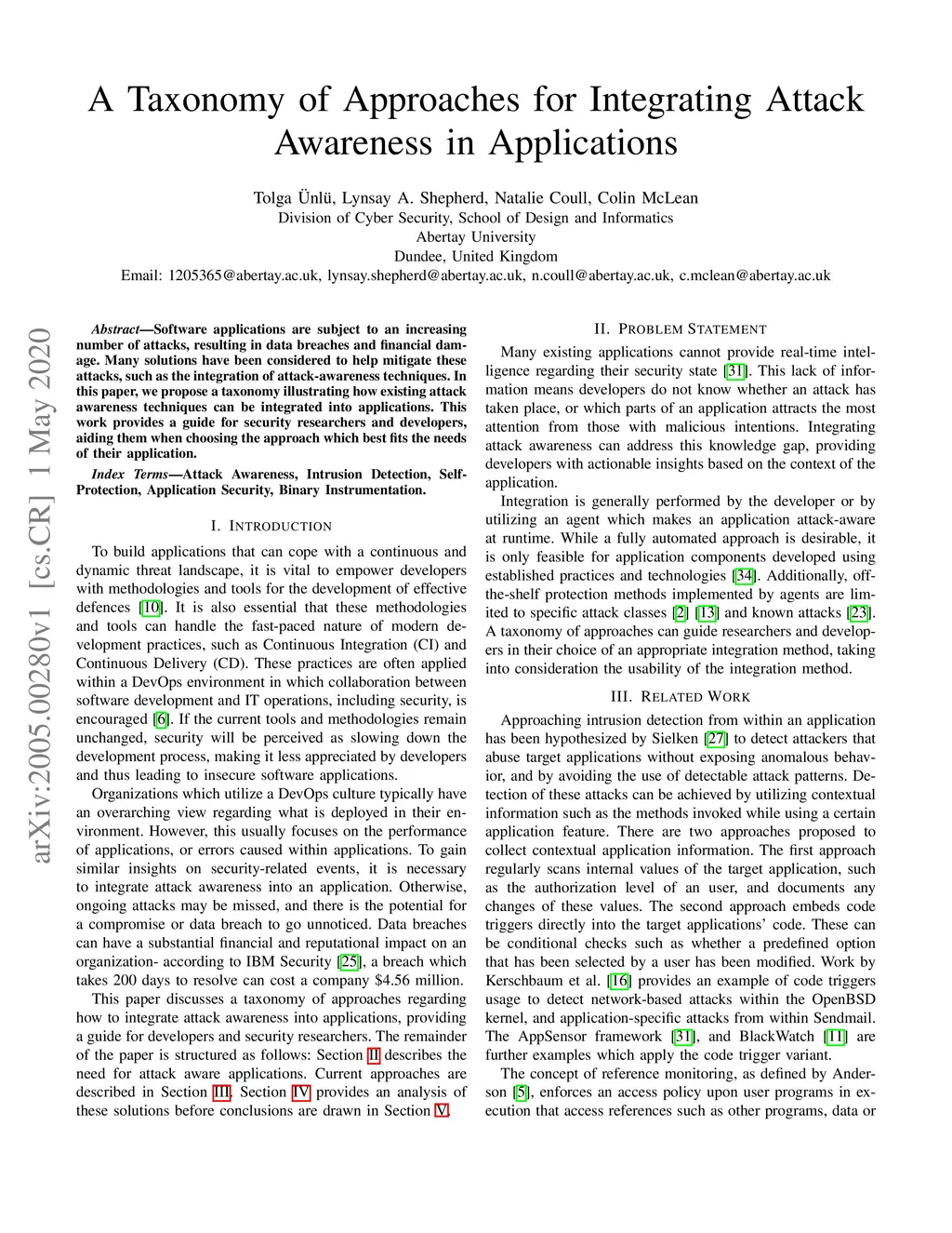 Software applications are subject to an increasing number of attacks, resulting in data breaches and financial damage. Many solutions have been considered to help mitigate these attacks, such as the integration of attack-awareness techniques. In this paper, we propose a taxonomy illustrating how existing attack awareness techniques can be integrated into applications. This work provides a guide for security researchers and developers, aiding them when choosing the approach which best fits the needs of their application.