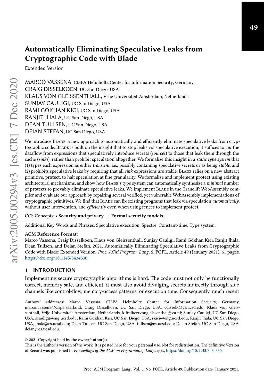 We introduce BLADE, a new approach to automatically and efficiently eliminate speculative leaks from cryptographic code. BLADE is built on the insight that to stop leaks via speculation, it suffices to the dataflow from expressions that speculatively introduce secrets () to those that leak them through the cache (), rather than prohibit speculation altogether. We formalize this insight in a that (1) types each expression as either , i.e., possibly containing speculative secrets or as being , and (2) prohibits speculative leaks by requiring that all expressions are stable. BLADE relies on a new new abstract primitive, , to halt speculation at fine granularity. We formalize and implement using existing architectural mechanisms, and show how BLADE's type system can automatically synthesize a number of s to provably eliminate speculative leaks. We implement BLADE in the Cranelift WebAssembly compiler and evaluate our approach by repairing several verified, yet vulnerable WebAssembly implementations of cryptographic primitives. We find that Blade can fix existing programs that leak via speculation , without user intervention, and , imposing less than 20% overhead even when using fences to implement .