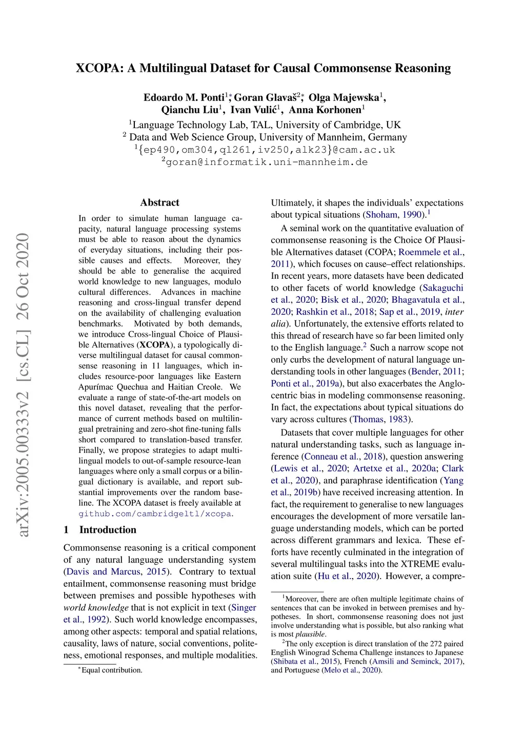 XCOPA: A Multilingual Dataset for Causal Commonsense Reasoning