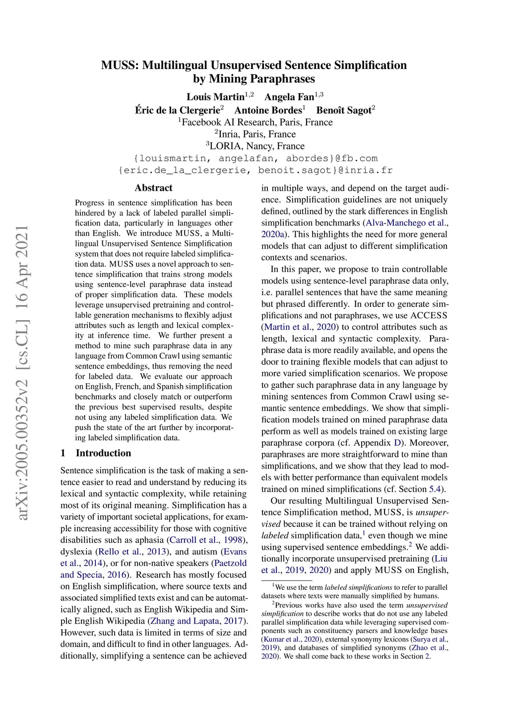 Progress in sentence simplification has been hindered by a lack of labeled parallel simplification data, particularly in languages other than English. We introduce MUSS, a Multilingual Unsupervised Sentence Simplification system that does not require labeled simplification data. MUSS uses a novel approach to sentence simplification that trains strong models using sentence-level paraphrase data instead of proper simplification data. These models leverage unsupervised pretraining and controllable generation mechanisms to flexibly adjust attributes such as length and lexical complexity at inference time. We further present a method to mine such paraphrase data in any language from Common Crawl using semantic sentence embeddings, thus removing the need for labeled data. We evaluate our approach on English, French, and Spanish simplification benchmarks and closely match or outperform the previous best supervised results, despite not using any labeled simplification data. We push the state of the art further by incorporating labeled simplification data.