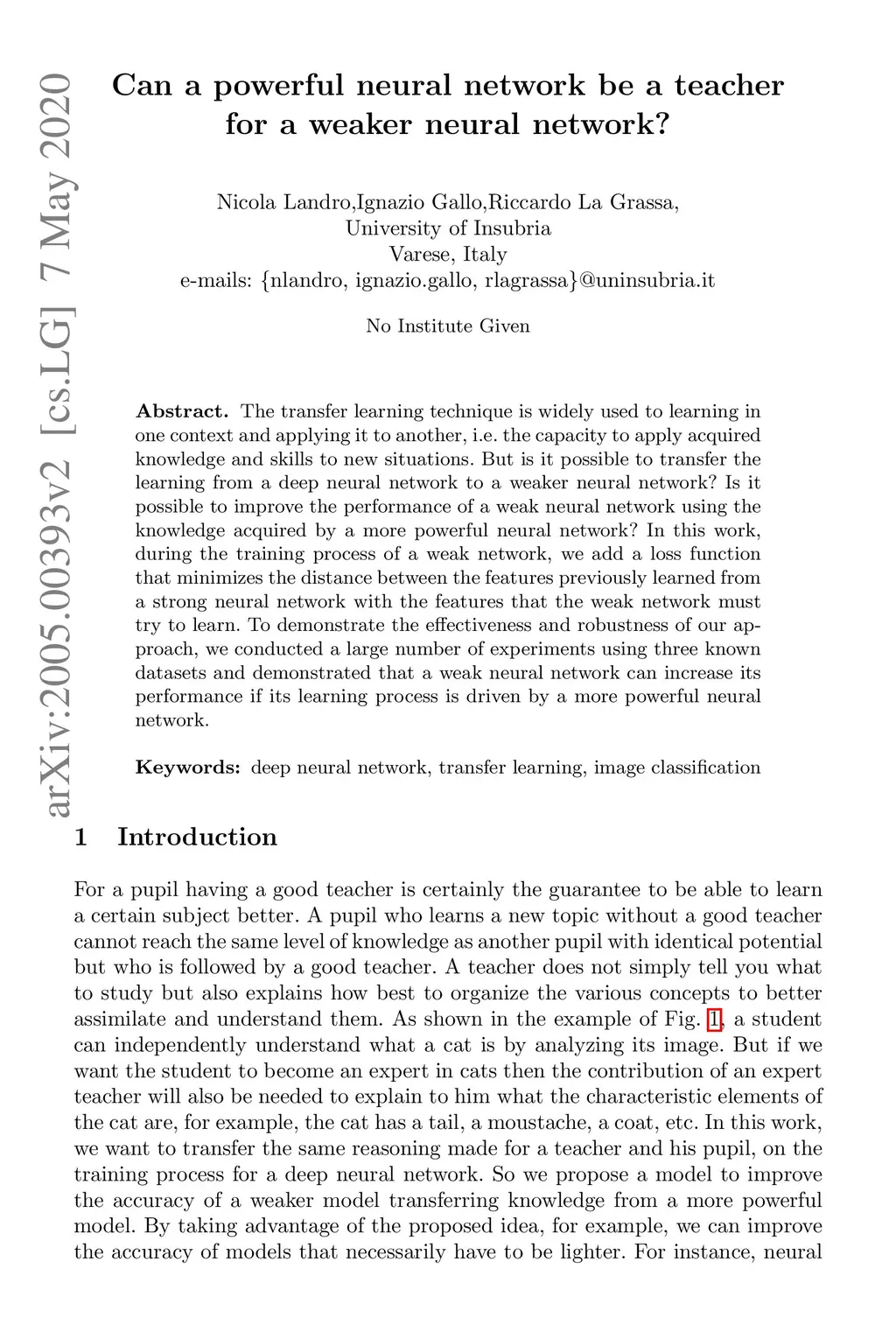 The transfer learning technique is widely used to learning in one context and applying it to another, i.e. the capacity to apply acquired knowledge and skills to new situations. But is it possible to transfer the learning from a deep neural network to a weaker neural network? Is it possible to improve the performance of a weak neural network using the knowledge acquired by a more powerful neural network? In this work, during the training process of a weak network, we add a loss function that minimizes the distance between the features previously learned from a strong neural network with the features that the weak network must try to learn. To demonstrate the effectiveness and robustness of our approach, we conducted a large number of experiments using three known datasets and demonstrated that a weak neural network can increase its performance if its learning process is driven by a more powerful neural network.