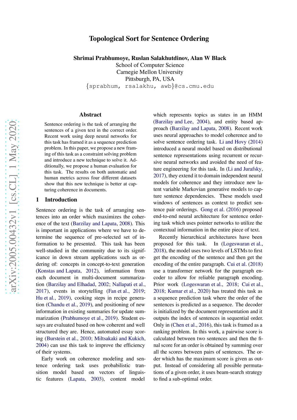 Sentence ordering is the task of arranging the sentences of a given text in the correct order. Recent work using deep neural networks for this task has framed it as a sequence prediction problem. In this paper, we propose a new framing of this task as a constraint solving problem and introduce a new technique to solve it. Additionally, we propose a human evaluation for this task. The results on both automatic and human metrics across four different datasets show that this new technique is better at capturing coherence in documents.