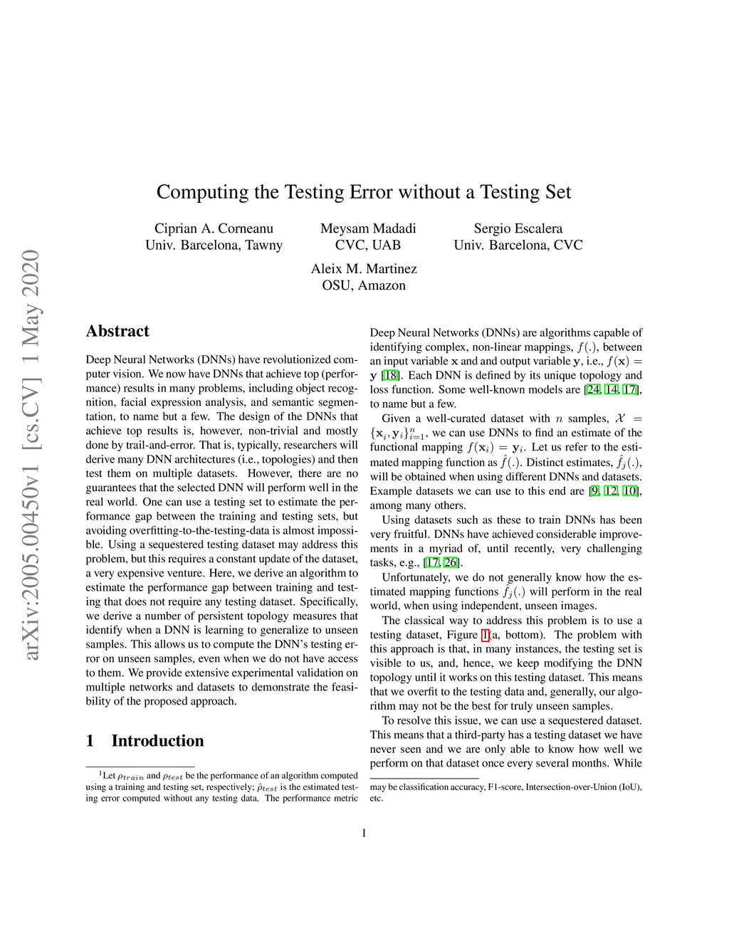 Deep Neural Networks (DNNs) have revolutionized computer vision. We now have DNNs that achieve top (performance) results in many problems, including object recognition, facial expression analysis, and semantic segmentation, to name but a few. The design of the DNNs that achieve top results is, however, non-trivial and mostly done by trail-and-error. That is, typically, researchers will derive many DNN architectures (i.e., topologies) and then test them on multiple datasets. However, there are no guarantees that the selected DNN will perform well in the real world. One can use a testing set to estimate the performance gap between the training and testing sets, but avoiding overfitting-to-the-testing-data is almost impossible. Using a sequestered testing dataset may address this problem, but this requires a constant update of the dataset, a very expensive venture. Here, we derive an algorithm to estimate the performance gap between training and testing that does not require any testing dataset. Specifically, we derive a number of persistent topology measures that identify when a DNN is learning to generalize to unseen samples. This allows us to compute the DNN's testing error on unseen samples, even when we do not have access to them. We provide extensive experimental validation on multiple networks and datasets to demonstrate the feasibility of the proposed approach.