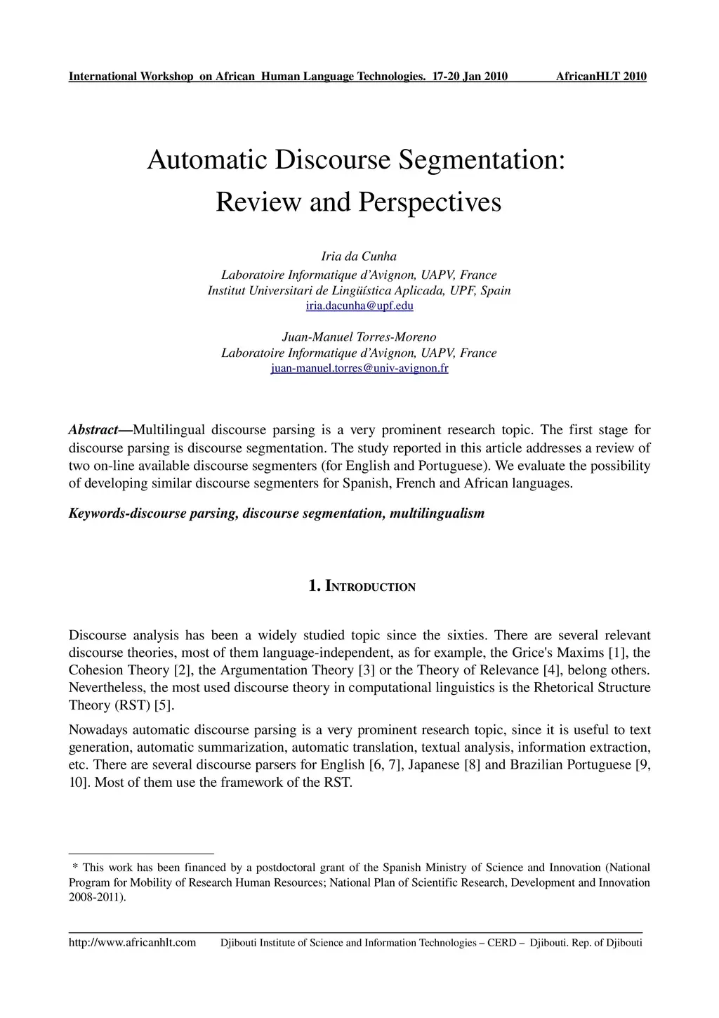 Multilingual discourse parsing is a very prominent research topic. The first stage for discourse parsing is discourse segmentation. The study reported in this article addresses a review of two on-line available discourse segmenters (for English and Portuguese). We evaluate the possibility of developing similar discourse segmenters for Spanish, French and African languages.