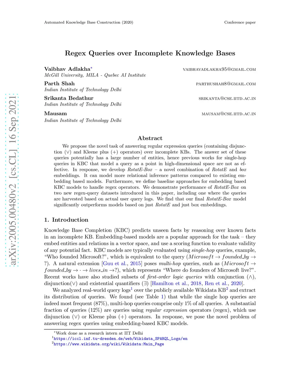 We propose the novel task of answering regular expression queries (containing disjunction () and Kleene plus () operators) over incomplete KBs. The answer set of these queries potentially has a large number of entities, hence previous works for single-hop queries in KBC that model a query as a point in high-dimensional space are not as effective. In response, we develop RotatE-Box -- a novel combination of RotatE and box embeddings. It can model more relational inference patterns compared to existing embedding based models. Furthermore, we define baseline approaches for embedding based KBC models to handle regex operators. We demonstrate performance of RotatE-Box on two new regex-query datasets introduced in this paper, including one where the queries are harvested based on actual user query logs. We find that our final RotatE-Box model significantly outperforms models based on just RotatE and just box embeddings.