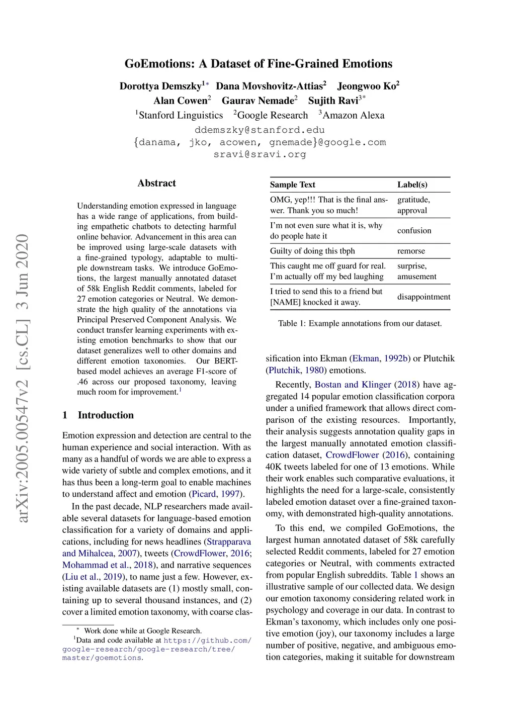 Understanding emotion expressed in language has a wide range of applications, from building empathetic chatbots to detecting harmful online behavior. Advancement in this area can be improved using large-scale datasets with a fine-grained typology, adaptable to multiple downstream tasks. We introduce GoEmotions, the largest manually annotated dataset of 58k English Reddit comments, labeled for 27 emotion categories or Neutral. We demonstrate the high quality of the annotations via Principal Preserved Component Analysis. We conduct transfer learning experiments with existing emotion benchmarks to show that our dataset generalizes well to other domains and different emotion taxonomies. Our BERT-based model achieves an average F1-score of .46 across our proposed taxonomy, leaving much room for improvement.