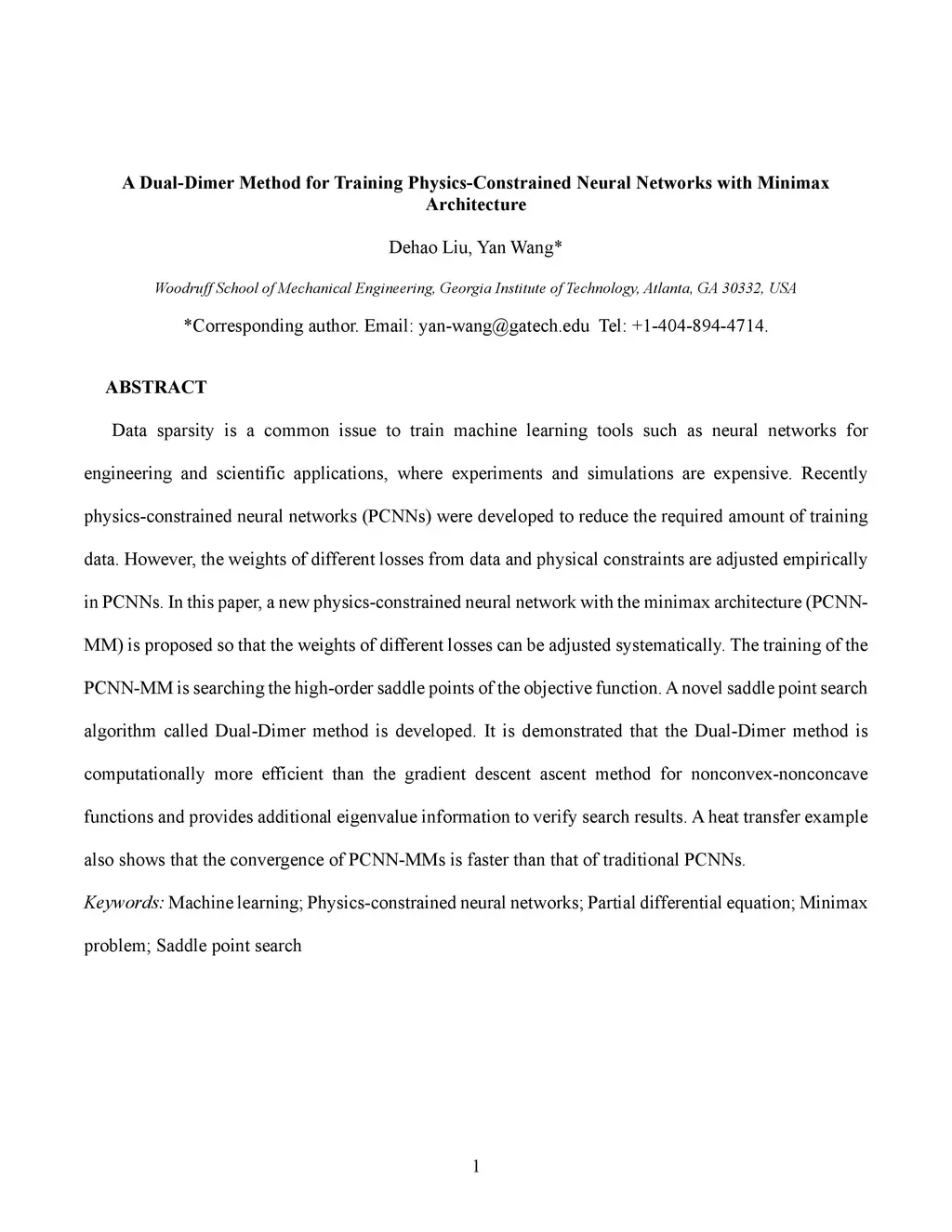 Data sparsity is a common issue to train machine learning tools such as neural networks for engineering and scientific applications, where experiments and simulations are expensive. Recently physics-constrained neural networks (PCNNs) were developed to reduce the required amount of training data. However, the weights of different losses from data and physical constraints are adjusted empirically in PCNNs. In this paper, a new physics-constrained neural network with the minimax architecture (PCNN-MM) is proposed so that the weights of different losses can be adjusted systematically. The training of the PCNN-MM is searching the high-order saddle points of the objective function. A novel saddle point search algorithm called Dual-Dimer method is developed. It is demonstrated that the Dual-Dimer method is computationally more efficient than the gradient descent ascent method for nonconvex-nonconcave functions and provides additional eigenvalue information to verify search results. A heat transfer example also shows that the convergence of PCNN-MMs is faster than that of traditional PCNNs.