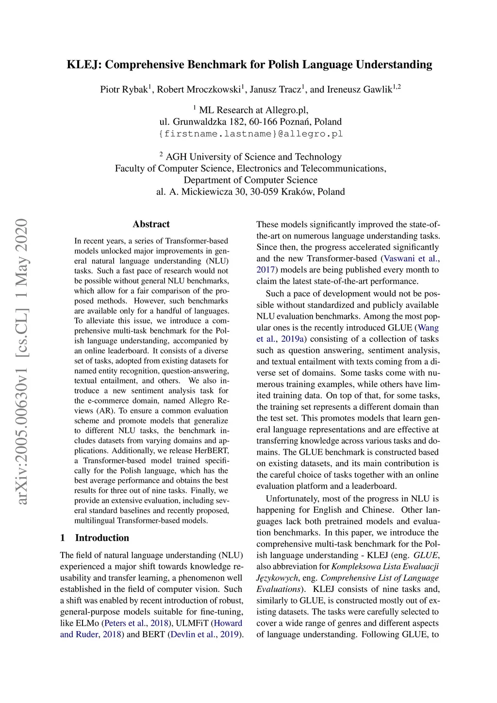 KLEJ: Comprehensive Benchmark for Polish Language Understanding