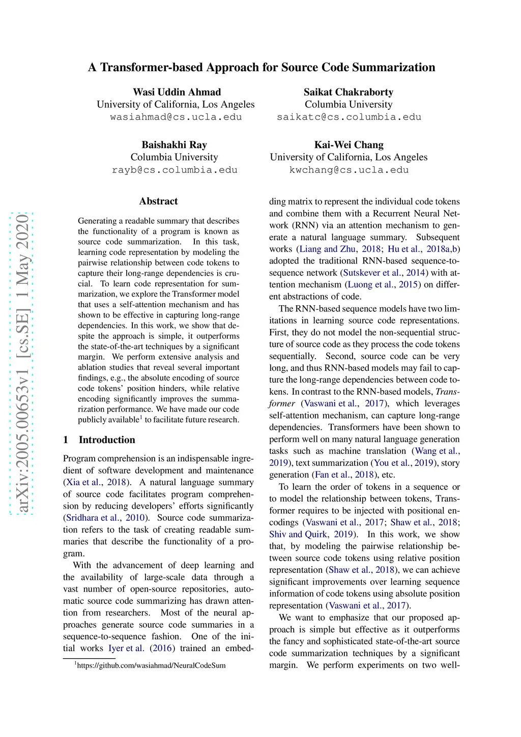 A Transformer-based Approach for Source Code Summarization