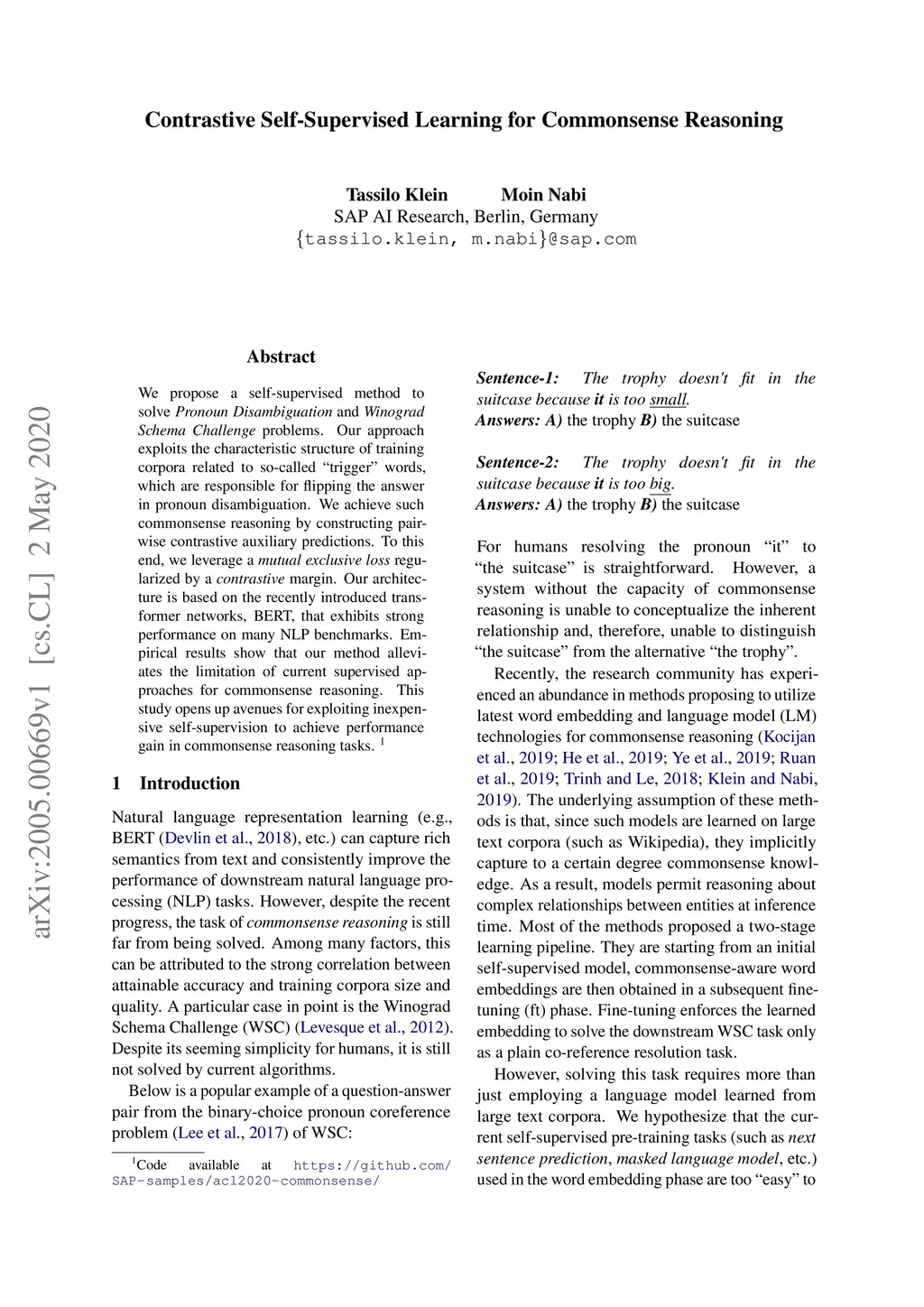 Contrastive Self-Supervised Learning for Commonsense Reasoning