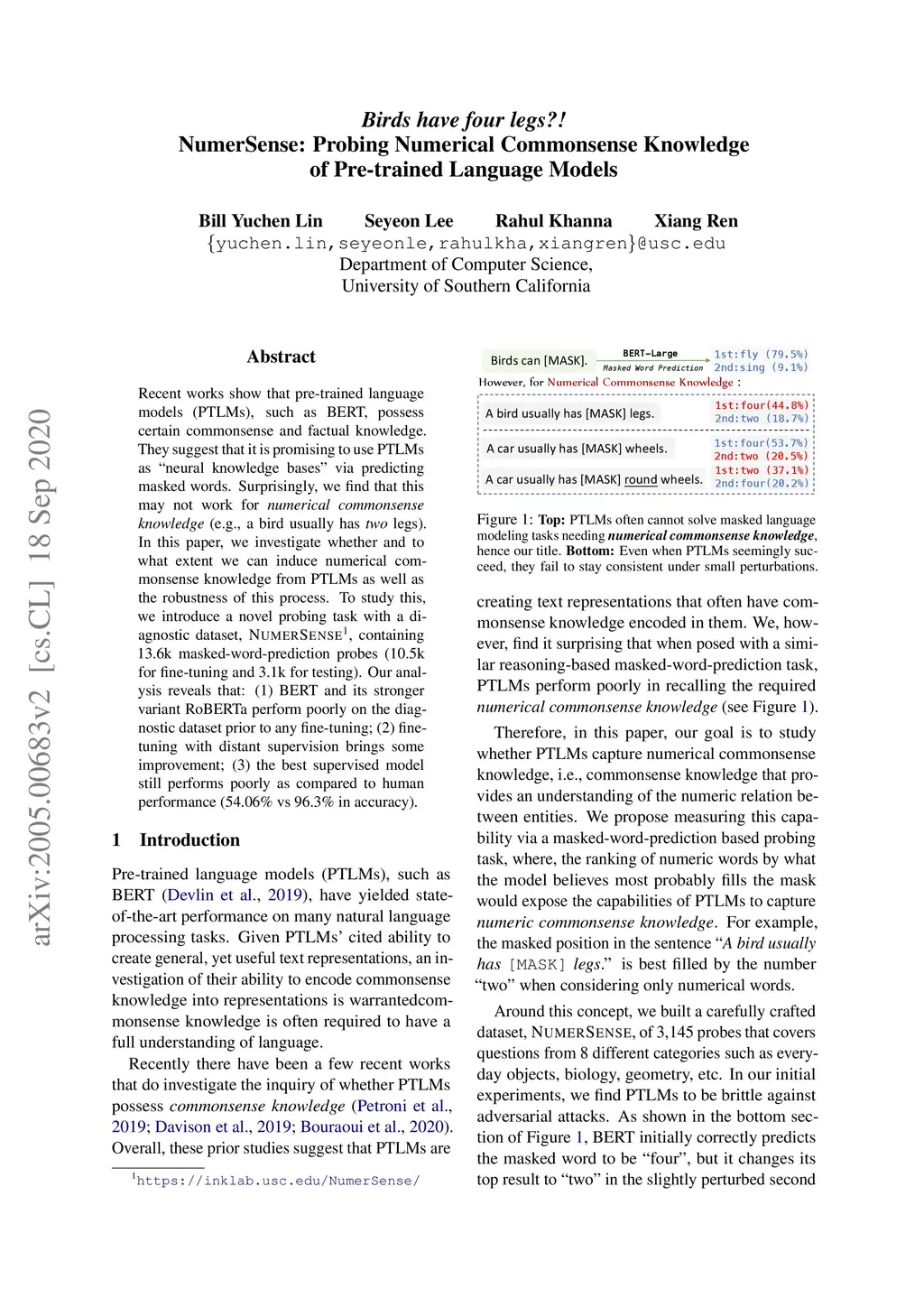 Recent works show that pre-trained language models (PTLMs), such as BERT, possess certain commonsense and factual knowledge. They suggest that it is promising to use PTLMs as "neural knowledge bases" via predicting masked words. Surprisingly, we find that this may not work for numerical commonsense knowledge (e.g., a bird usually has two legs). In this paper, we investigate whether and to what extent we can induce numerical commonsense knowledge from PTLMs as well as the robustness of this process. To study this, we introduce a novel probing task with a diagnostic dataset, NumerSense, containing 13.6k masked-word-prediction probes (10.5k for fine-tuning and 3.1k for testing). Our analysis reveals that: (1) BERT and its stronger variant RoBERTa perform poorly on the diagnostic dataset prior to any fine-tuning; (2) fine-tuning with distant supervision brings some improvement; (3) the best supervised model still performs poorly as compared to human performance (54.06% vs 96.3% in accuracy).