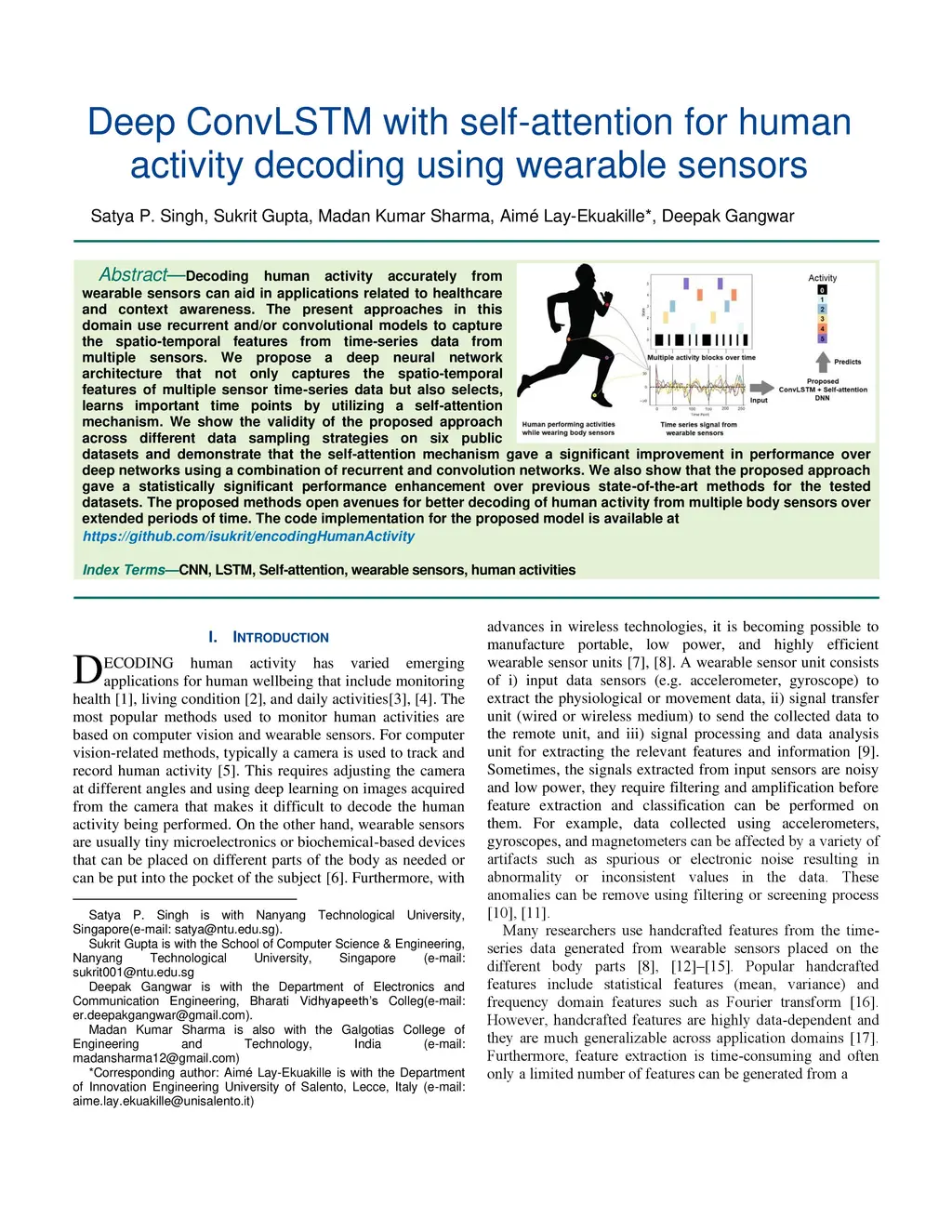 Decoding human activity accurately from wearable sensors can aid in applications related to healthcare and context awareness. The present approaches in this domain use recurrent and/or convolutional models to capture the spatio-temporal features from time-series data from multiple sensors. We propose a deep neural network architecture that not only captures the spatio-temporal features of multiple sensor time-series data but also selects, learns important time points by utilizing a self-attention mechanism. We show the validity of the proposed approach across different data sampling strategies on six public datasets and demonstrate that the self-attention mechanism gave a significant improvement in performance over deep networks using a combination of recurrent and convolution networks. We also show that the proposed approach gave a statistically significant performance enhancement over previous state-of-the-art methods for the tested datasets. The proposed methods open avenues for better decoding of human activity from multiple body sensors over extended periods of time. The code implementation for the proposed model is available at https://github.com/isukrit/encodingHumanActivity.