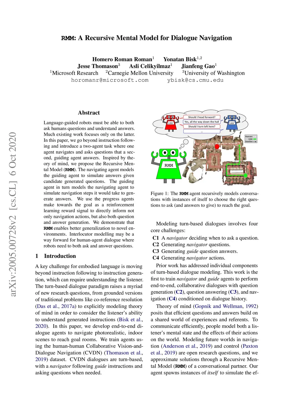 Language-guided robots must be able to both ask humans questions and understand answers. Much existing work focuses only on the latter. In this paper, we go beyond instruction following and introduce a two-agent task where one agent navigates and asks questions that a second, guiding agent answers. Inspired by theory of mind, we propose the Recursive Mental Model (RMM). The navigating agent models the guiding agent to simulate answers given candidate generated questions. The guiding agent in turn models the navigating agent to simulate navigation steps it would take to generate answers. We use the progress agents make towards the goal as a reinforcement learning reward signal to directly inform not only navigation actions, but also both question and answer generation. We demonstrate that RMM enables better generalization to novel environments. Interlocutor modelling may be a way forward for human-agent dialogue where robots need to both ask and answer questions.