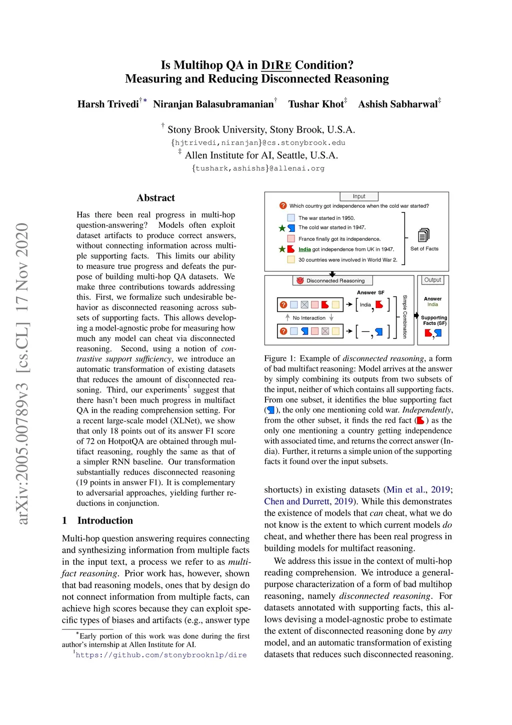 Has there been real progress in multi-hop question-answering? Models often exploit dataset artifacts to produce correct answers, without connecting information across multiple supporting facts. This limits our ability to measure true progress and defeats the purpose of building multi-hop QA datasets. We make three contributions towards addressing this. First, we formalize such undesirable behavior as disconnected reasoning across subsets of supporting facts. This allows developing a model-agnostic probe for measuring how much any model can cheat via disconnected reasoning. Second, using a notion of \emph{contrastive support sufficiency}, we introduce an automatic transformation of existing datasets that reduces the amount of disconnected reasoning. Third, our experiments suggest that there hasn't been much progress in multi-hop QA in the reading comprehension setting. For a recent large-scale model (XLNet), we show that only 18 points out of its answer F1 score of 72 on HotpotQA are obtained through multifact reasoning, roughly the same as that of a simpler RNN baseline. Our transformation substantially reduces disconnected reasoning (19 points in answer F1). It is complementary to adversarial approaches, yielding further reductions in conjunction.
