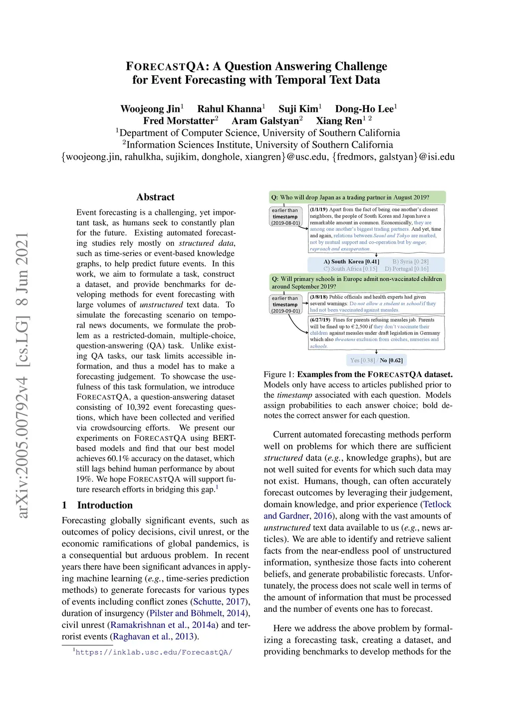 ForecastQA: A Question Answering Challenge for Event Forecasting