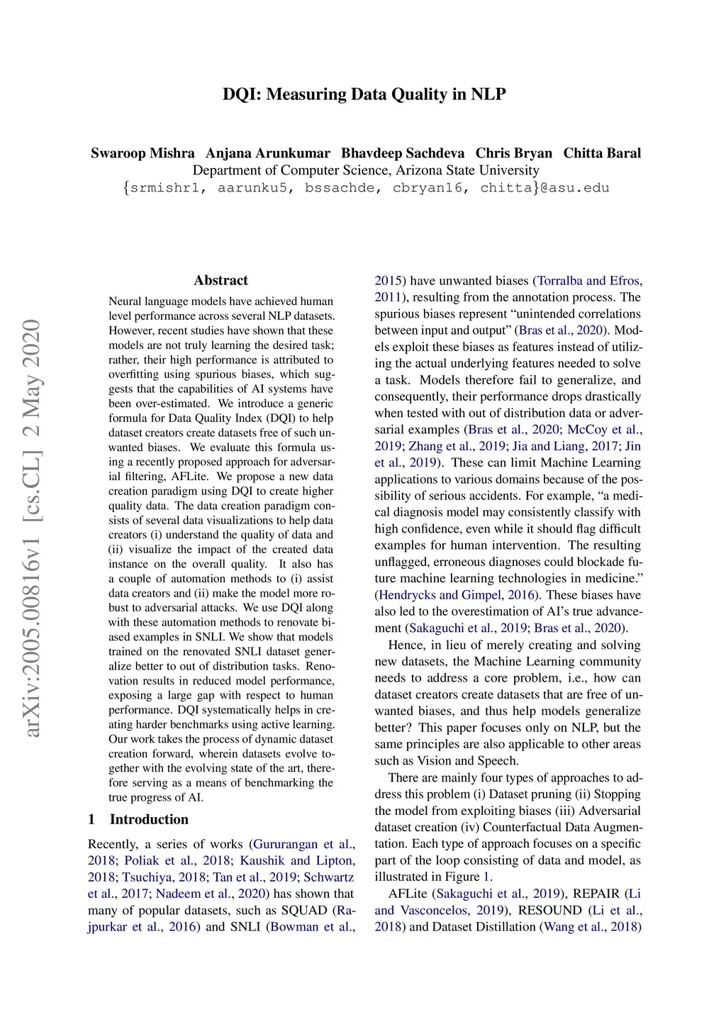 Neural language models have achieved human level performance across several NLP datasets. However, recent studies have shown that these models are not truly learning the desired task; rather, their high performance is attributed to overfitting using spurious biases, which suggests that the capabilities of AI systems have been over-estimated. We introduce a generic formula for Data Quality Index (DQI) to help dataset creators create datasets free of such unwanted biases. We evaluate this formula using a recently proposed approach for adversarial filtering, AFLite. We propose a new data creation paradigm using DQI to create higher quality data. The data creation paradigm consists of several data visualizations to help data creators (i) understand the quality of data and (ii) visualize the impact of the created data instance on the overall quality. It also has a couple of automation methods to (i) assist data creators and (ii) make the model more robust to adversarial attacks. We use DQI along with these automation methods to renovate biased examples in SNLI. We show that models trained on the renovated SNLI dataset generalize better to out of distribution tasks. Renovation results in reduced model performance, exposing a large gap with respect to human performance. DQI systematically helps in creating harder benchmarks using active learning. Our work takes the process of dynamic dataset creation forward, wherein datasets evolve together with the evolving state of the art, therefore serving as a means of benchmarking the true progress of AI.