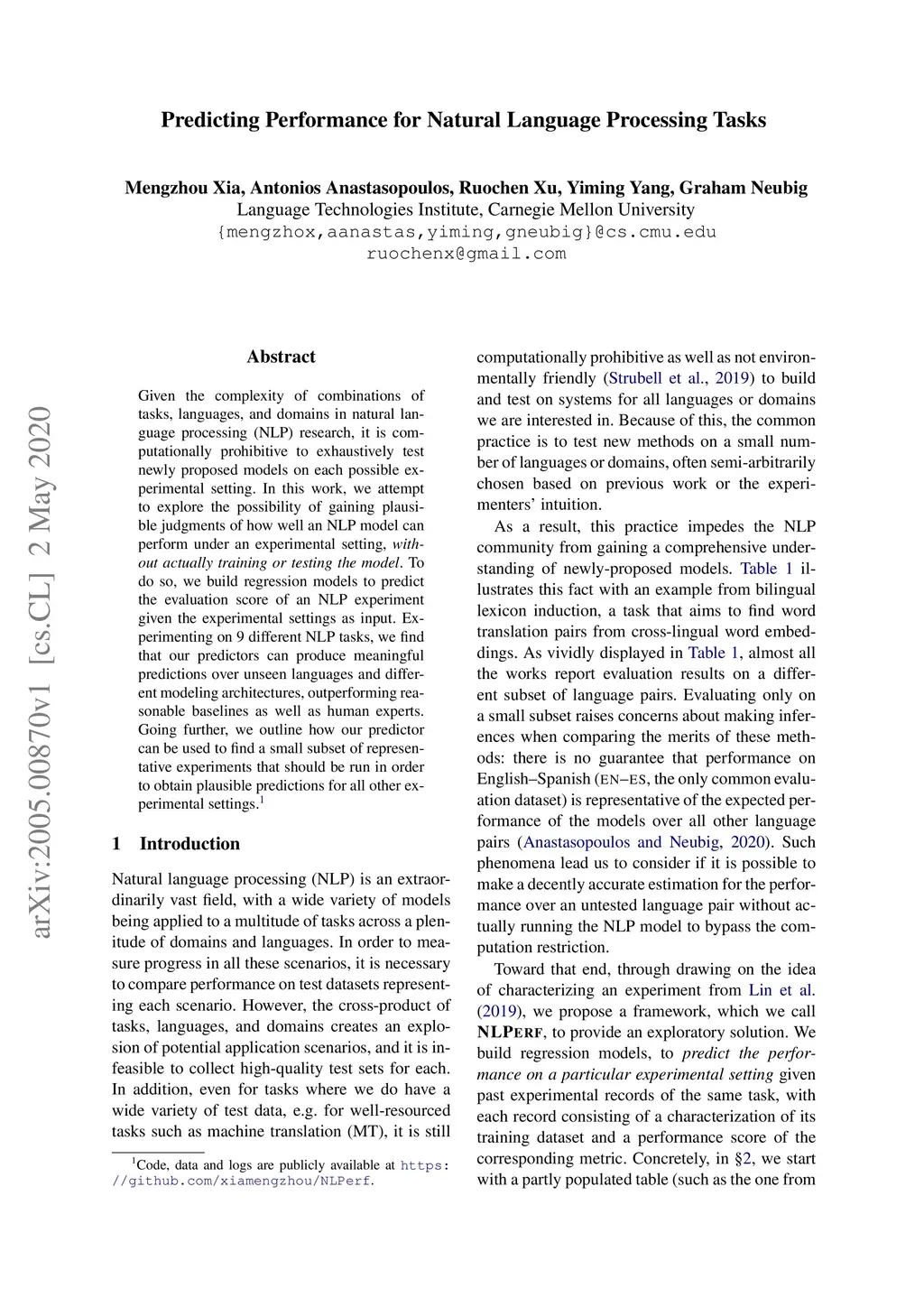 Given the complexity of combinations of tasks, languages, and domains in natural language processing (NLP) research, it is computationally prohibitive to exhaustively test newly proposed models on each possible experimental setting. In this work, we attempt to explore the possibility of gaining plausible judgments of how well an NLP model can perform under an experimental setting, without actually training or testing the model. To do so, we build regression models to predict the evaluation score of an NLP experiment given the experimental settings as input. Experimenting on 9 different NLP tasks, we find that our predictors can produce meaningful predictions over unseen languages and different modeling architectures, outperforming reasonable baselines as well as human experts. Going further, we outline how our predictor can be used to find a small subset of representative experiments that should be run in order to obtain plausible predictions for all other experimental settings.