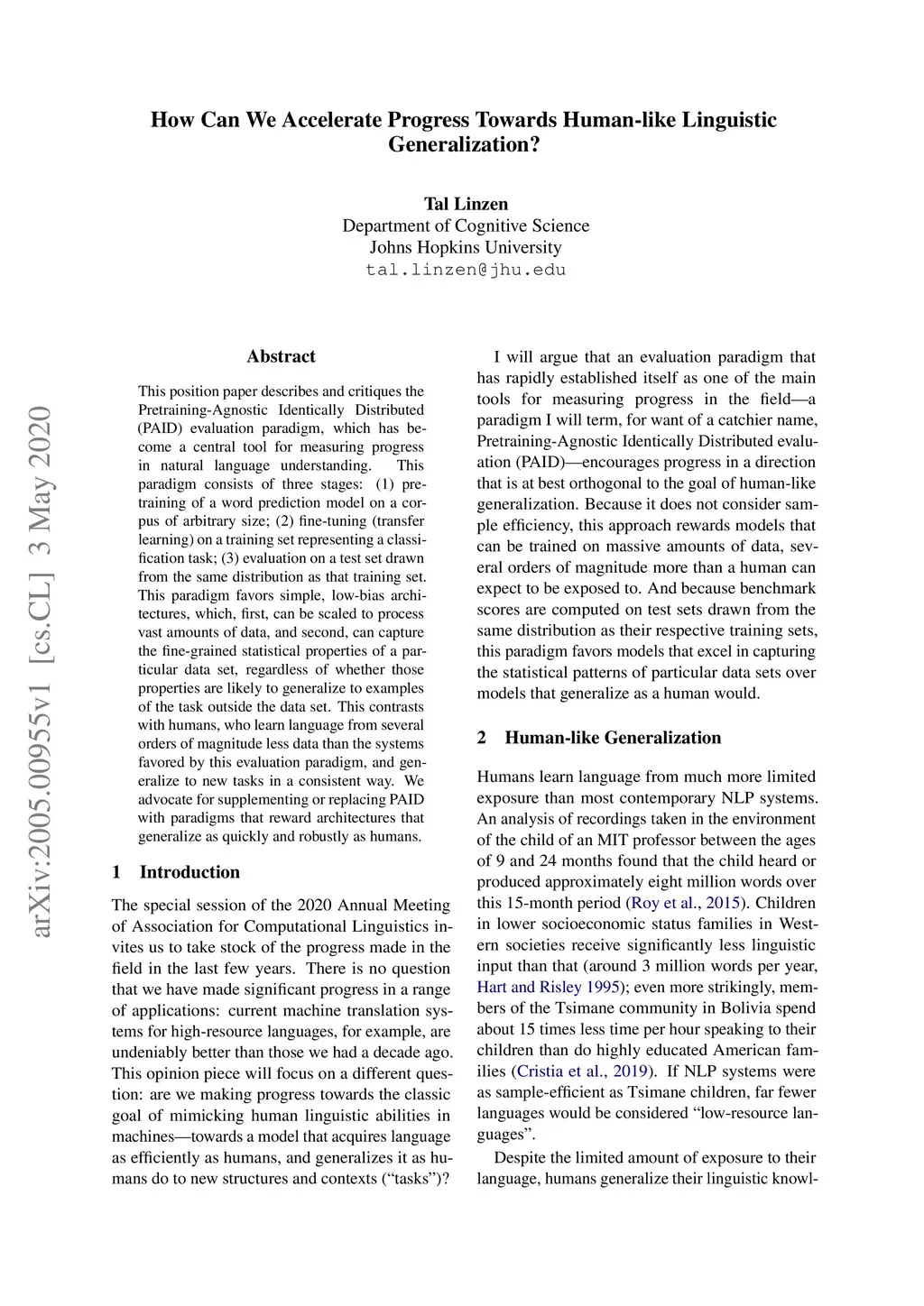 This position paper describes and critiques the Pretraining-Agnostic Identically Distributed (PAID) evaluation paradigm, which has become a central tool for measuring progress in natural language understanding. This paradigm consists of three stages: (1) pre-training of a word prediction model on a corpus of arbitrary size; (2) fine-tuning (transfer learning) on a training set representing a classification task; (3) evaluation on a test set drawn from the same distribution as that training set. This paradigm favors simple, low-bias architectures, which, first, can be scaled to process vast amounts of data, and second, can capture the fine-grained statistical properties of a particular data set, regardless of whether those properties are likely to generalize to examples of the task outside the data set. This contrasts with humans, who learn language from several orders of magnitude less data than the systems favored by this evaluation paradigm, and generalize to new tasks in a consistent way. We advocate for supplementing or replacing PAID with paradigms that reward architectures that generalize as quickly and robustly as humans.
