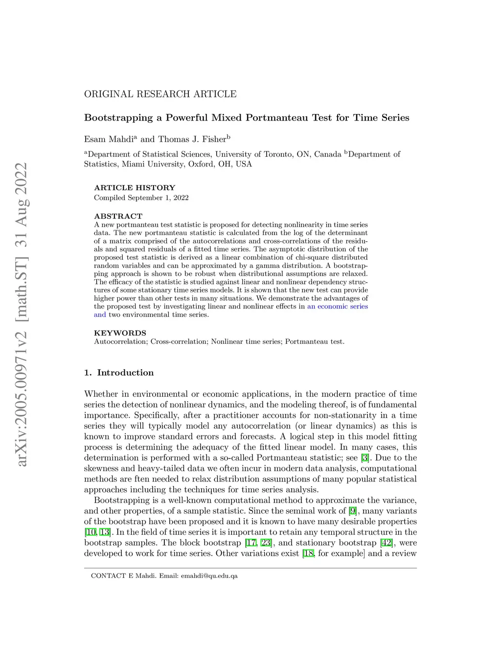 A new portmanteau test statistic is proposed for detecting nonlinearity in time series data. In this paper, we elaborate on the Toeplitz autocorrelation matrix to the autocorrelation and cross-correlation of residuals and squared residuals block matrix. We derive a new portmanteau test statistic using the log of the determinant of the mth autocorrelations and cross-correlations block matrix. The asymptotic distribution of the proposed test statistic is derived as a linear combination of chi-squared distributions and can be approximated by a gamma distribution. This test is applied to identify the linearity and nonlinearity dependency of some stationary time series models. It is shown that the convergence of the new test to its asymptotic distribution is reasonable with higher power than other tests in many situations. We demonstrate the efficiency of the proposed test by investigating linear and nonlinear effects in Vodafone Qatar and Nikkei-300 daily returns.
