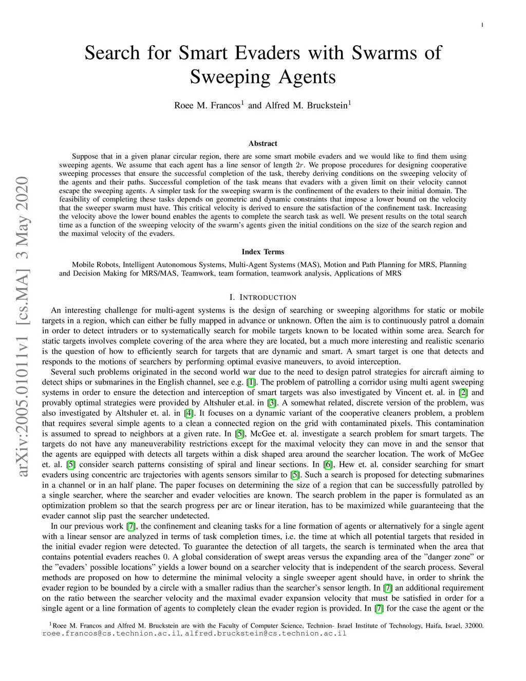 Suppose that in a given planar circular region, there are some smart mobile evaders and we would like to find them using sweeping agents. We assume that each agent has a line sensor of length 2r. We propose procedures for designing cooperative sweeping processes that ensure the successful completion of the task, thereby deriving conditions on the sweeping velocity of the agents and their paths. Successful completion of the task means that evaders with a given limit on their velocity cannot escape the sweeping agents. A simpler task for the sweeping swarm is the confinement of the evaders to their initial domain. The feasibility of completing these tasks depends on geometric and dynamic constraints that impose a lower bound on the velocity that the sweeper swarm must have. This critical velocity is derived to ensure the satisfaction of the confinement task. Increasing the velocity above the lower bound enables the agents to complete the search task as well. We present results on the total search time as a function of the sweeping velocity of the swarm's agents given the initial conditions on the size of the search region and the maximal velocity of the evaders.
