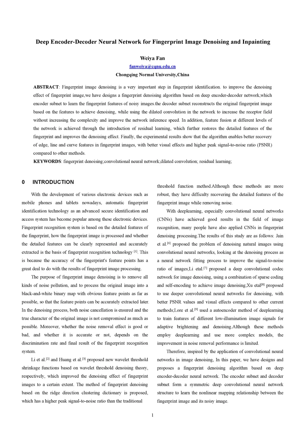 Fingerprint image denoising is a very important step in fingerprint identification. to improve the denoising effect of fingerprint image,we have designs a fingerprint denoising algorithm based on deep encoder-decoder network,which encoder subnet to learn the fingerprint features of noisy images.the decoder subnet reconstructs the original fingerprint image based on the features to achieve denoising, while using the dilated convolution in the network to increase the receptor field without increasing the complexity and improve the network inference speed. In addition, feature fusion at different levels of the network is achieved through the introduction of residual learning, which further restores the detailed features of the fingerprint and improves the denoising effect. Finally, the experimental results show that the algorithm enables better recovery of edge, line and curve features in fingerprint images, with better visual effects and higher peak signal-to-noise ratio (PSNR) compared to other methods.