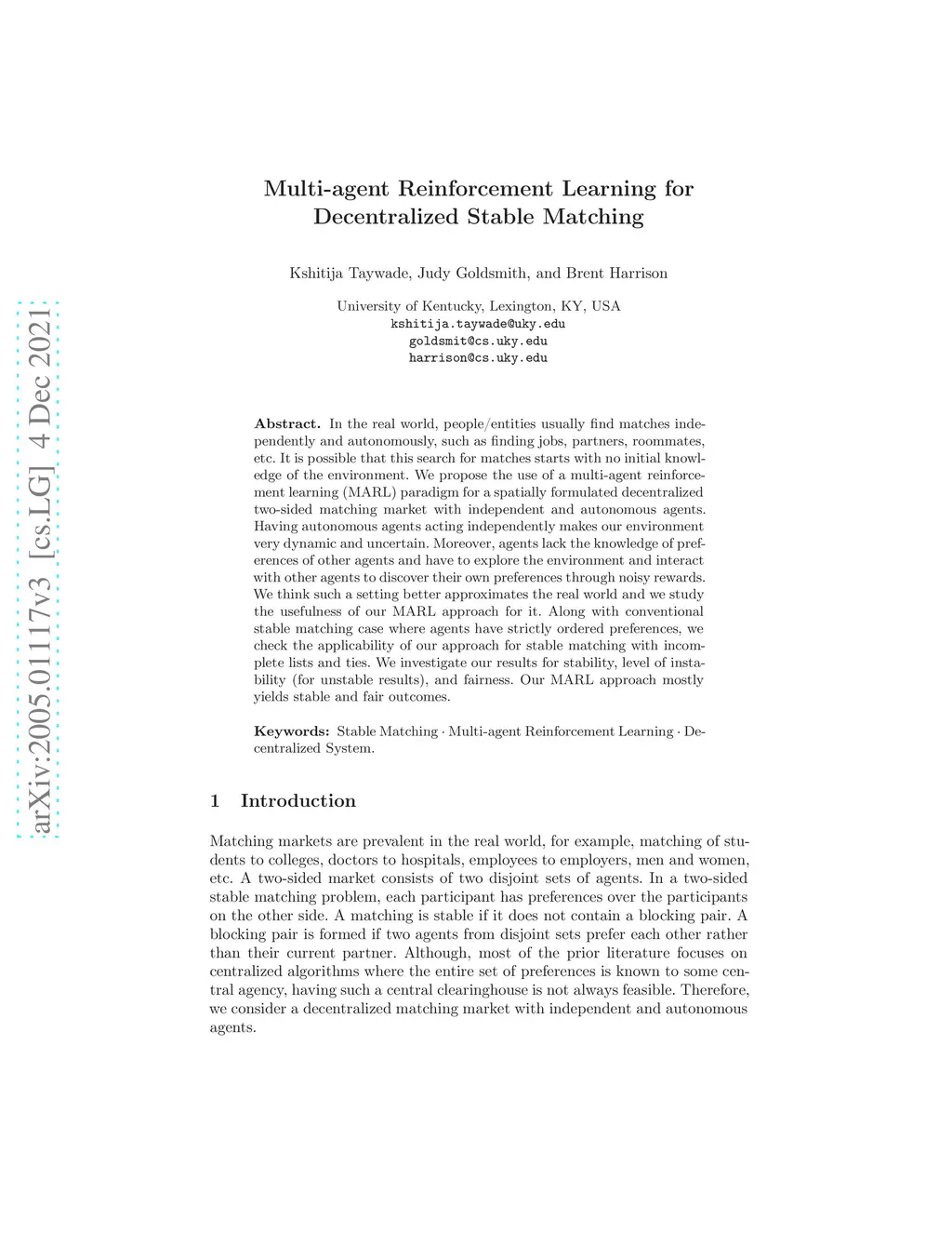 In the real world, people/entities usually find matches independently and autonomously, such as finding jobs, partners, roommates, etc. It is possible that this search for matches starts with no initial knowledge of the environment. We propose the use of a multi-agent reinforcement learning (MARL) paradigm for a spatially formulated decentralized two-sided matching market with independent and autonomous agents. Having autonomous agents acting independently makes our environment very dynamic and uncertain. Moreover, agents lack the knowledge of preferences of other agents and have to explore the environment and interact with other agents to discover their own preferences through noisy rewards. We think such a setting better approximates the real world and we study the usefulness of our MARL approach for it. Along with conventional stable matching case where agents have strictly ordered preferences, we check the applicability of our approach for stable matching with incomplete lists and ties. We investigate our results for stability, level of instability (for unstable results), and fairness. Our MARL approach mostly yields stable and fair outcomes.